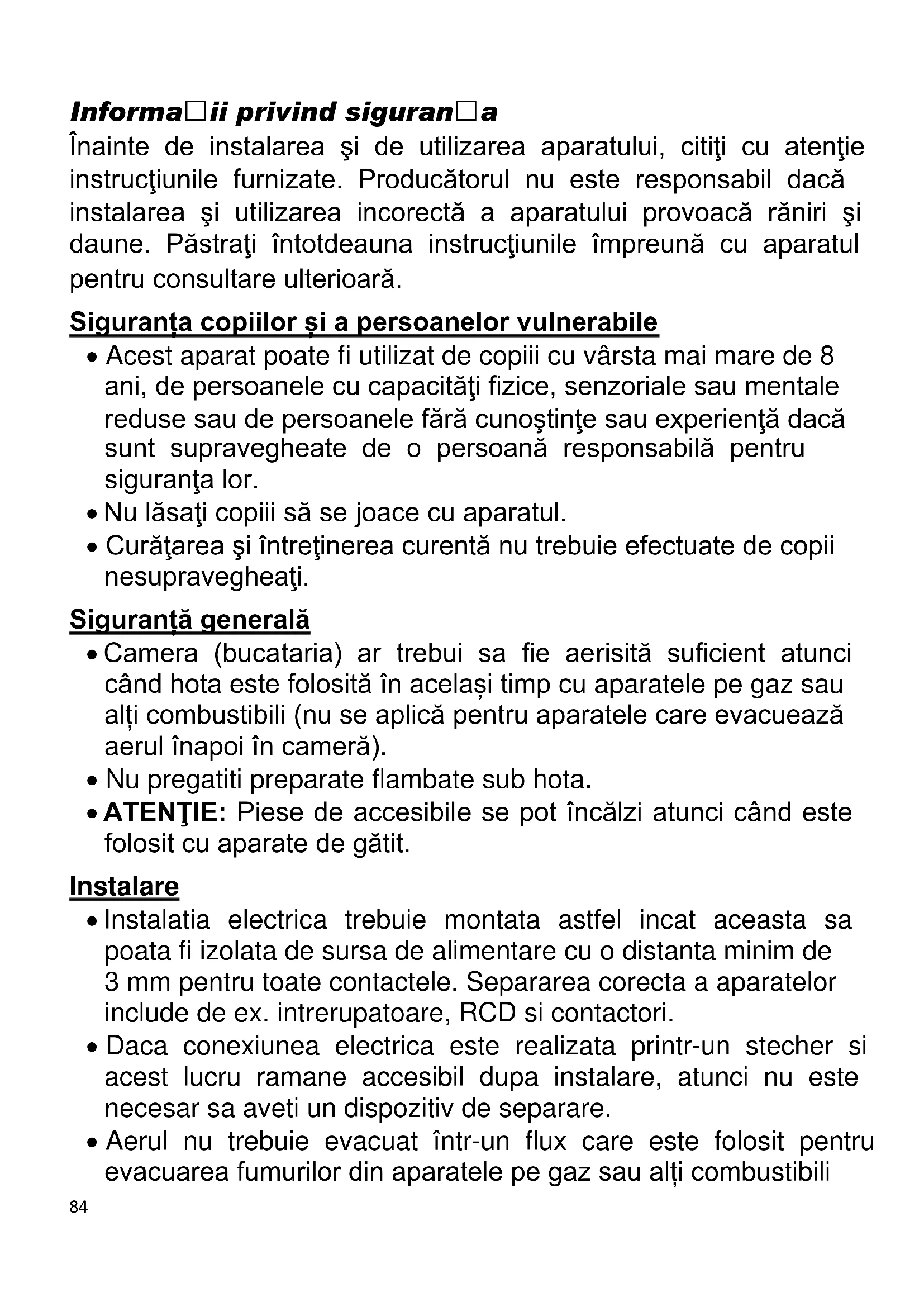 Потребителите трябва да се свържат с местните власти или пунктове за отпадъци, за да получат информация къде да оставят своите стари уреди. Преди да изхвърлите Вашия стар уред направете го неизползваем като издърпате захранващия кабел, а след това го отрежете и изхвърлете.84 InformaČii privind siguranČa Înainte de instalarea şi de utilizarea aparatului, citiţi cu atenţie instrucţiunile furnizate. Producătorul nu este responsabil dacă instalarea şi utilizarea incorectă a aparatului provoacă răniri şi daune. Păstraţi întotdeauna instrucţiunile împreună cu aparatul pentru consultare ulterioară. Siguranța copiilor și a persoanelor vulnerabile Acest aparat poate fi utilizat de copiii cu vârsta mai mare de 8 ani, de persoanele cu capacităţi fizice, senzoriale sau mentale reduse sau de persoanele fără cunoştinţe sau experienţă dacă sunt supravegheate de o persoană responsabilă pentru siguranţa lor. Nu lăsaţi copiii să se joace cu aparatul. Curăţarea şi întreţinerea curentă nu trebuie efectuate de copii nesupravegheaţi. Siguranță generală Camera (bucataria) ar trebui sa fie aerisită suficient atunci când hota este folosită în același timp cu aparatele pe gaz sau alți combustibili (nu se aplică pentru aparatele care evacuează aerul înapoi în cameră). Nu pregatiti preparate flambate sub hota. ATENŢIE: Piese de accesibile se pot încălzi atunci când este folosit cu aparate de gătit. Instalare Instalatia electrica trebuie montata astfel incat aceasta sa poata fi izolata de sursa de alimentare cu o distanta minim de 3 mm pentru toate contactele. Separarea corecta a aparatelor include de ex. intrerupatoare, RCD si contactori. Daca conexiunea electrica este realizata printr-un stecher si acest lucru ramane accesibil dupa instalare, atunci nu este necesar sa aveti un dispozitiv de separare. Aerul nu trebuie evacuat într-un flux care este folosit pentru evacuarea fumurilor din aparatele pe gaz sau alți combustibili85