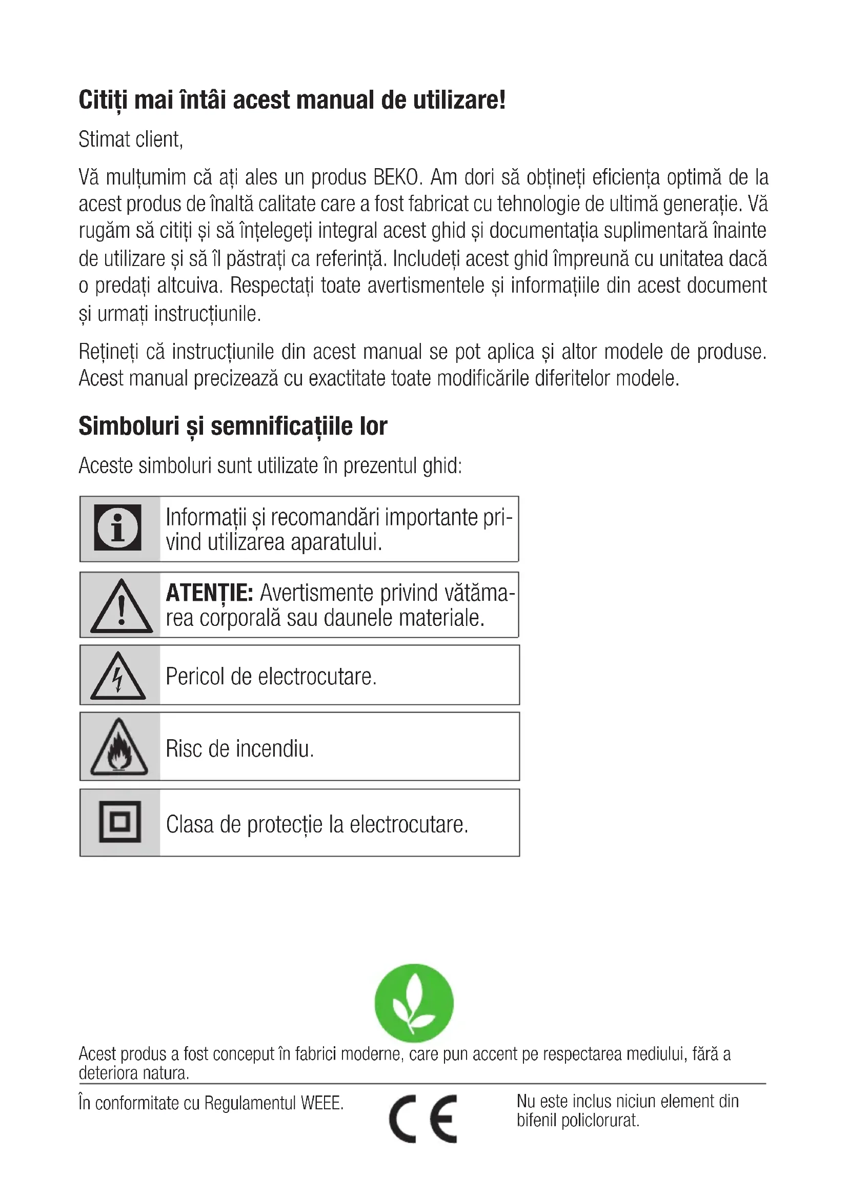 Pericol de electrocutare. Risc de incendiu. Clasa de protecție la electrocutare. În conformitate cu Regulamentul WEEE.Nu este inclus niciun element din bifenil policlorurat.Acest produs a fost conceput în fabrici moderne, care pun accent pe respectarea mediului, fără a deteriora natura.Hotă / Manual de utilizare 177 / RO 1 Instrucțiuni importante referitoare la siguranță și mediul înconjurător