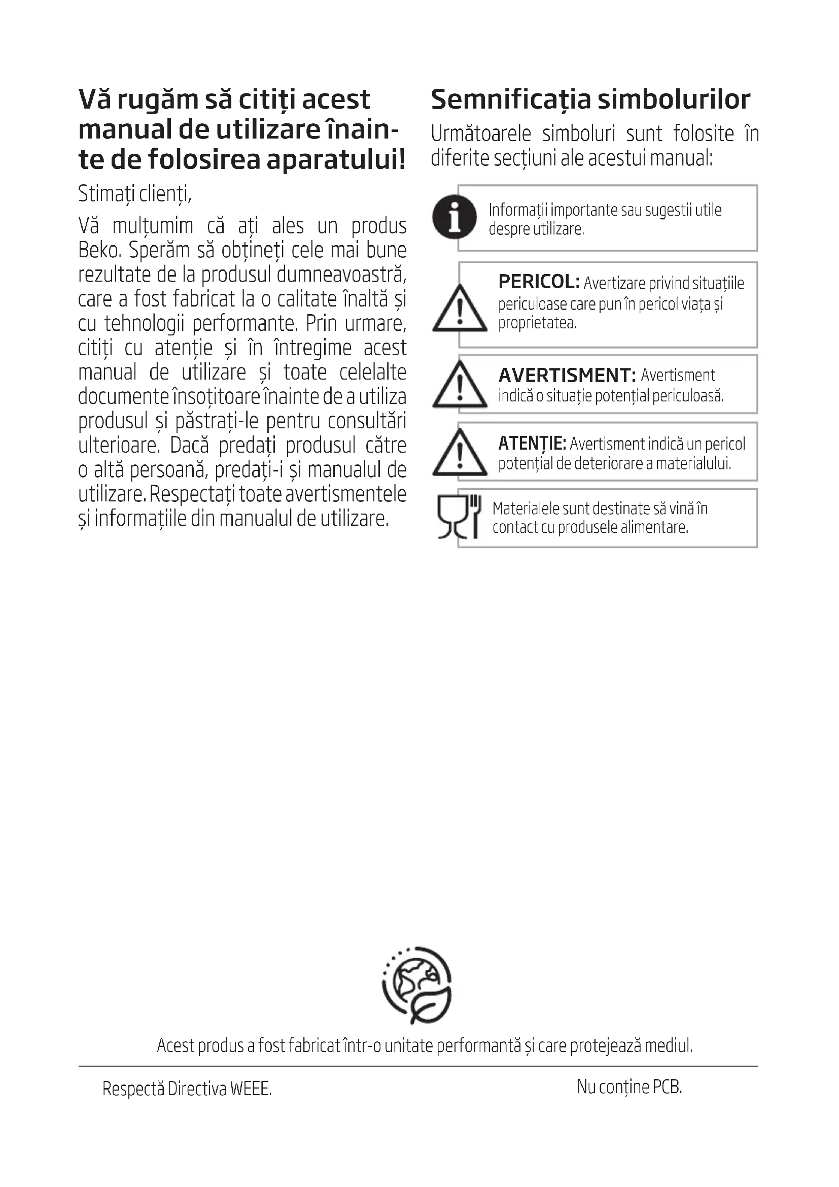 Niniejsze warunki gwarancji mają zastosowanie do Urządzeń zakupionych od dnia 01.03.2019 r. Gwarant oświadcza, że niniejsza Gwarancja jest udzielana Użytkownikowi dodatkowo i nie wyłącza, nie ogranicza ani nie zawiesza uprawnień Użytkownika wynikających z przepisów o rękojmi za wady rzeczy sprzedanej na podstawie Kodeksu cywilnego.Vă rugăm să citiți acest manual de utilizare înain- te de folosirea aparatului! Stimați clienți, Vă mulțumim că ați ales un produs Beko. Sperăm să obțineți cele mai bune rezultate de la produsul dumneavoastră, care a fost fabricat la o calitate înaltă și cu tehnologii performante. Prin urmare, citiți cu atenție și în întregime acest manual de utilizare și toate celelalte documente însoțitoare înainte de a utiliza produsul și păstrați-le pentru consultări ulterioare. Dacă predați produsul către o altă persoană, predați-i și manualul de utilizare. Respectați toate avertismentele și informațiile din manualul de utilizare. Semnificația simbolurilor Următoarele simboluri sunt folosite în diferite secțiuni ale acestui manual: Informații importante sau sugestii utile despre utilizare. PERICOL: Avertizare privind situațiile periculoase care pun în pericol viața și proprietatea. AVERTISMENT: Avertisment indică o situație potențial periculoasă. ATENȚIE: Avertisment indică un pericol potențial de deteriorare a materialului. Materialele sunt destinate să vină în contact cu produsele alimentare. Acest produs a fost fabricat într-o unitate performantă și care protejează mediul. Respectă Directiva WEEE. Nu conține PCB.179/RO Mașină de cafea complet automată/Manual de utilizare 1 Instrucțiuni importante privind siguranța și mediul Această secțiune include instrucțiunile de siguranță care vă vor ajuta să vă protejați împotriva vătămărilor corporale și a riscurilor de pierderi materiale. Nerespectarea acestor instrucțiuni invalidează garanția furnizată