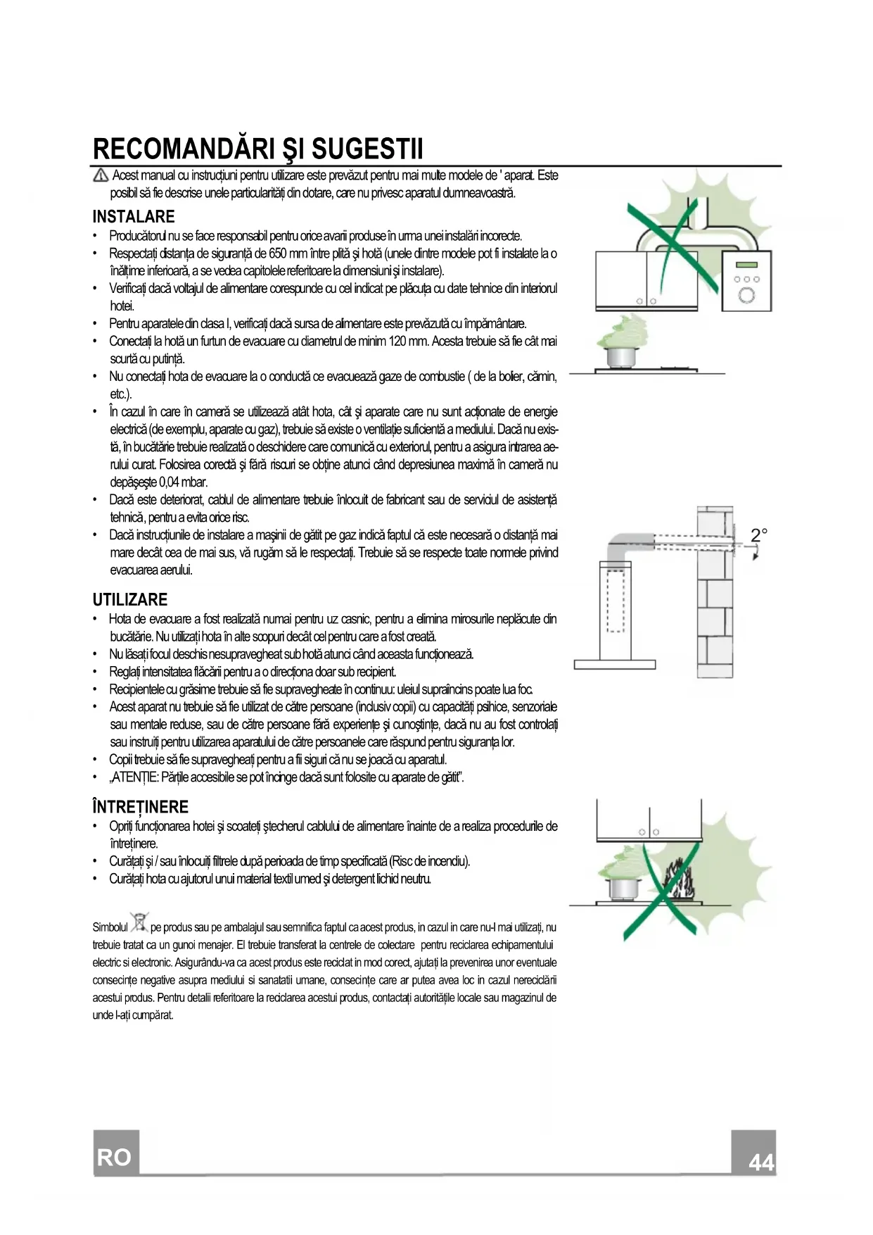 - Curăţaţi hota cu ajutorul unui material textil umed şi detergent lichid neutru. Simbolul pe produs sau pe ambalajul sau semnifica faptul ca acest produs, in cazul in care nu-l mai utilizaţi, nu trebuie tratat ca un gunoi menajer. El trebuie transferat la centrele de colectare pentru reciclarea echipamentului electric si electronic. Asigurându-va ca acest produs este reciclat in mod corect, ajutaţi la prevenirea unor eventuale consecinţe negative asupra mediului si sanatatii umane, consecinţe care ar putea avea loc in cazul nereciclării acestui produs. Pentru detalii referitoare la reciclarea acestui produs, contactaţi autorităţile locale sau magazinul de unde l-aţi cumpărat.