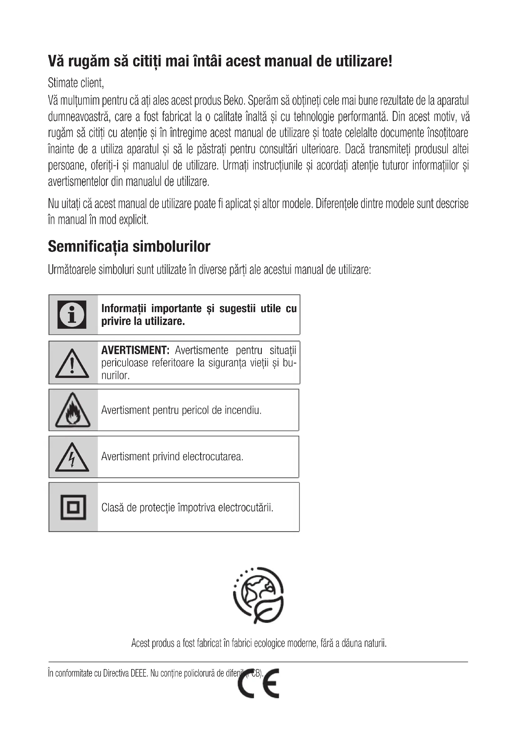 dodatkowo i nie wyłącza, nie ogranicza ani nie zawiesza uprawnień Użytkownika wynikających z przepisów o rękojmi za wady rzeczy sprzedanej na podstawie Kodeksu cywilnego.Vă rugăm să citiți mai întâi acest manual de utilizare! Stimate client, Vă mulțumim pentru că ați ales acest produs Beko. Sperăm să obțineți cele mai bune rezultate de la aparatul dumneavoastră, care a fost fabricat la o calitate înaltă și cu tehnologie performantă. Din acest motiv, vă rugăm să citiți cu atenție și în întregime acest manual de utilizare și toate celelalte documente însoțitoare înainte de a utiliza aparatul și să le păstrați pentru consultări ulterioare. Dacă transmiteți produsul altei persoane, oferiți-i și manualul de utilizare. Urmați instrucțiunile și acordați atenție tuturor informațiilor și avertismentelor din manualul de utilizare. Nu uitați că acest manual de utilizare poate fi aplicat și altor modele. Diferențele dintre modele sunt descrise în manual în mod explicit. Semnificația simbolurilor Următoarele simboluri sunt utilizate în diverse părți ale acestui manual de utilizare: