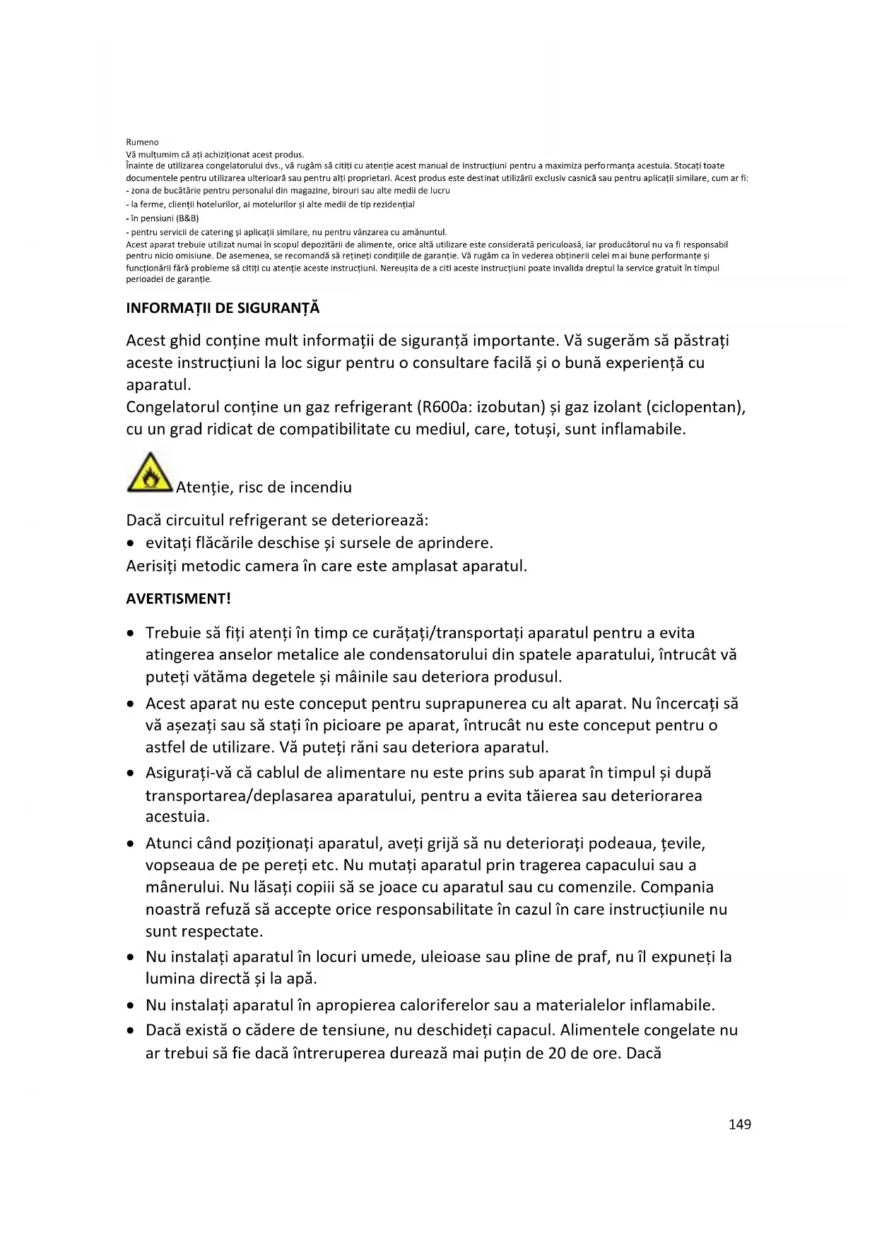Acest ghid conține mult informații de siguranță importante. Vă sugerăm să păstrați aceste instrucțiuni la loc sigur pentru o consultare facilă și o bună experiență cu aparatul. Congelatorul conține un gaz refrigerant (R600a: izobutan) și gaz izolant (ciclopentan), cu un grad ridicat de compatibilitate cu mediul, care, totuși, sunt inflamabile. Atenție, risc de incendiu Dacă circuitul refrigerant se deteriorează: