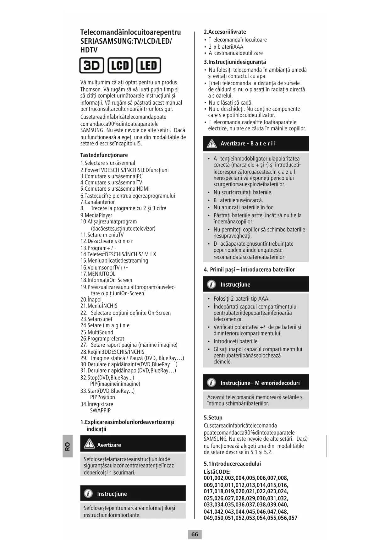 HDTV Vă mulţumim că aţioptat pentru un produs Thomson. Vă rugămsăvăluațipuțin timp și să citițicomplet următoarele instrucțiuni și informații. Vă rugămsăpăstraţiacest manual pentru consultare ulterioară într-un loc sigur. Cu setarea din fabrică telecomanda poate comanda cca 90% din toate aparatele SAMSUNG .Nueste nevoie de alte setări. Dacă nu funcționează alegețiuna din modalitățile de setaredescrise în capitolul 5. Taste de funcționare