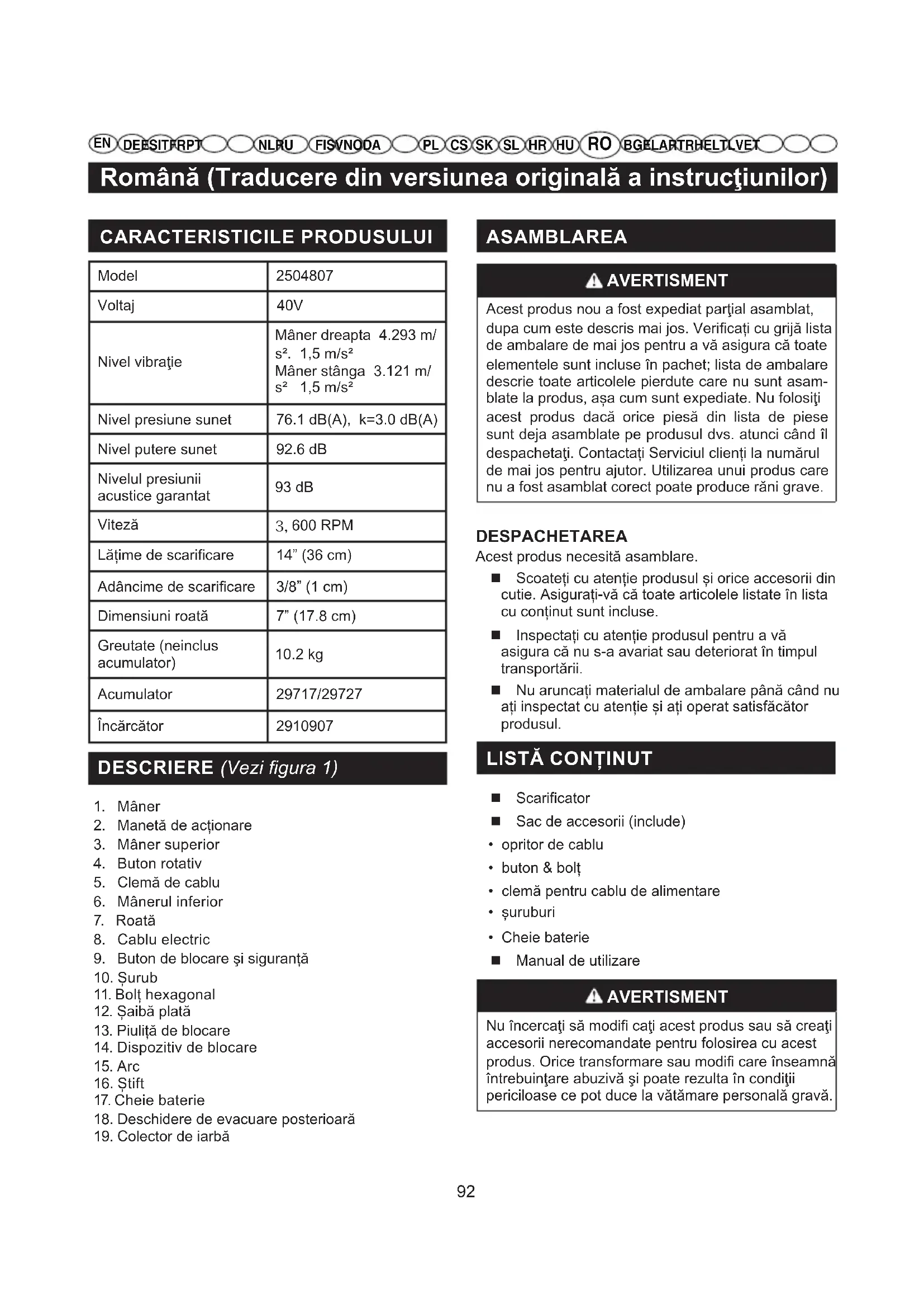 DE ES IT FR PTNL RUFI SV NO DA BG EL AR TR HE LT LV ET AVERTISMENT Opriți mașina și îndepărtați setul de acumula- tori. Asigurați-vă că toate părțile în mișcare s-au oprit complet. Nerespectarea acestei instrucțiuni poate duce la pornirea accidentală și la eventuale accidentări grave. AVERTISMENT Dacă orice piesă este deteriorată sau lipsă nu operaţi acest produs până când piesele nu sunt înlocuite. Utilizarea unui produs cu piese deteriorate sau lipsă ar putea duce la vătămări corporale grave. INSTALAREA MÂNERULUI INFERIOR(Vezi figu- ra 2) Introduceți mânerul inferior (6) în orificiul carcasei. Utilizați șuruburile furnizate (10), fixați mânerul inferior de carcasă cu ajutorul șurubelniței torx (neinclusă). INSTALAREA MÂNERULUI SUPERIOR(Vezi figura 2) Poziționați mânerul superior astfel încât orificiile să se alinieze cu orificiile mânerului inferior. Introduceți bolțul hexagonal furnizat (11) prin orificiu dinspre exteriorul ghidonului. Înfiletați butonul (4) în bolțul hexagonal (11) pentru a-l strânge bine în loc. INSTALAREA COLECTORULUI DE IARBĂ (Vezi figura 3) Ridicaţi uşa de golire posterioară. Ridicaţi maşina de tuns iarba de mânerele sale şi aşezaţi-o sub uşa din spate de evacuare în aşa fel încât cârligele maşinii de tuns iarba sunt aşezate pe tija uşii. Eliberaţi uşa din spate de evacuare. Când sunt instalate corect, cârligele maşinii de tuns iarba se vor prelungi prin deschizătura uşii din spate de evacuare. FUNCȚIONARE AVERTISMENT Nu slăbiţi vigilenţa odată ce vă simţiţi familiarizat cu aparatul. Nu uitaţi niciodată că o secundă de neatenţie este su cientă pentru a vă răni foarte grav. AVERTISMENT Purtaţi întotdeauna ochelari de protecţie. Nerespec- tarea acestei reguli poate antrena proiectarea de corpuri străine în ochi şi poate provoca răniri oculare grave. AVERTISMENT Nu lăsaţi deloc lichidul de frână, benzina, produsele pe bază de petrol, uleiurile penetrante etc., să intre în con- tact cu piesele din plastic. Produsele chimice pot dete- riora, slăbi sau distruge plasticul, ceea ce poate cauza vătămări grave. Only the parts shown on the parts list are intended to be repaired or replaced by the customer. All other parts should be replaced at an Authorized ser- vice center. PENTRU A SCOATE ACUMULATORUL (Vezi figura 4) Eliberați maneta de acționare pentru a opri produsul. Deschideți ușița bateriei pentru a accesa compartimentul bateriei. Îndepărtați cheia de acumulatori. Apăsați și țineți apăsat butonul de eliberare a acumulatorului cu o prindere fermă. Scoateţi acumulatorul din produs. PENTRU A INSTALA ACUMULATORUL(Vezi figura 4) Ridicaţi şi ţineţi sus capacul acumulatorului. Aliniați acumulatorul cu portul acumulatorului scarificatorului. Asigurați-vă că butonul de eliberare a acumulatorului se blochează pe poziție și că setul de acumulatori este fixat în locașul său din scarificator înainte de a-l pune în funcțiune. Introduceți cheia bateriei. Dacă aparatul nu este folosit imediat nu introduceți cheia bateriei. Închideţi uşa. PORNIREA SCARIFICATORULUI Apăsați și țineți apăsat butonul de blocare de siguranță. This makes the bale switch operational Strângeți maneta de acționare de ghidon pentru funcționare. OPRIREA SCARIFICATORULUI Eliberați maneta de acționareRomână (Traducere din versiunea originală a instrucţiunilor)
