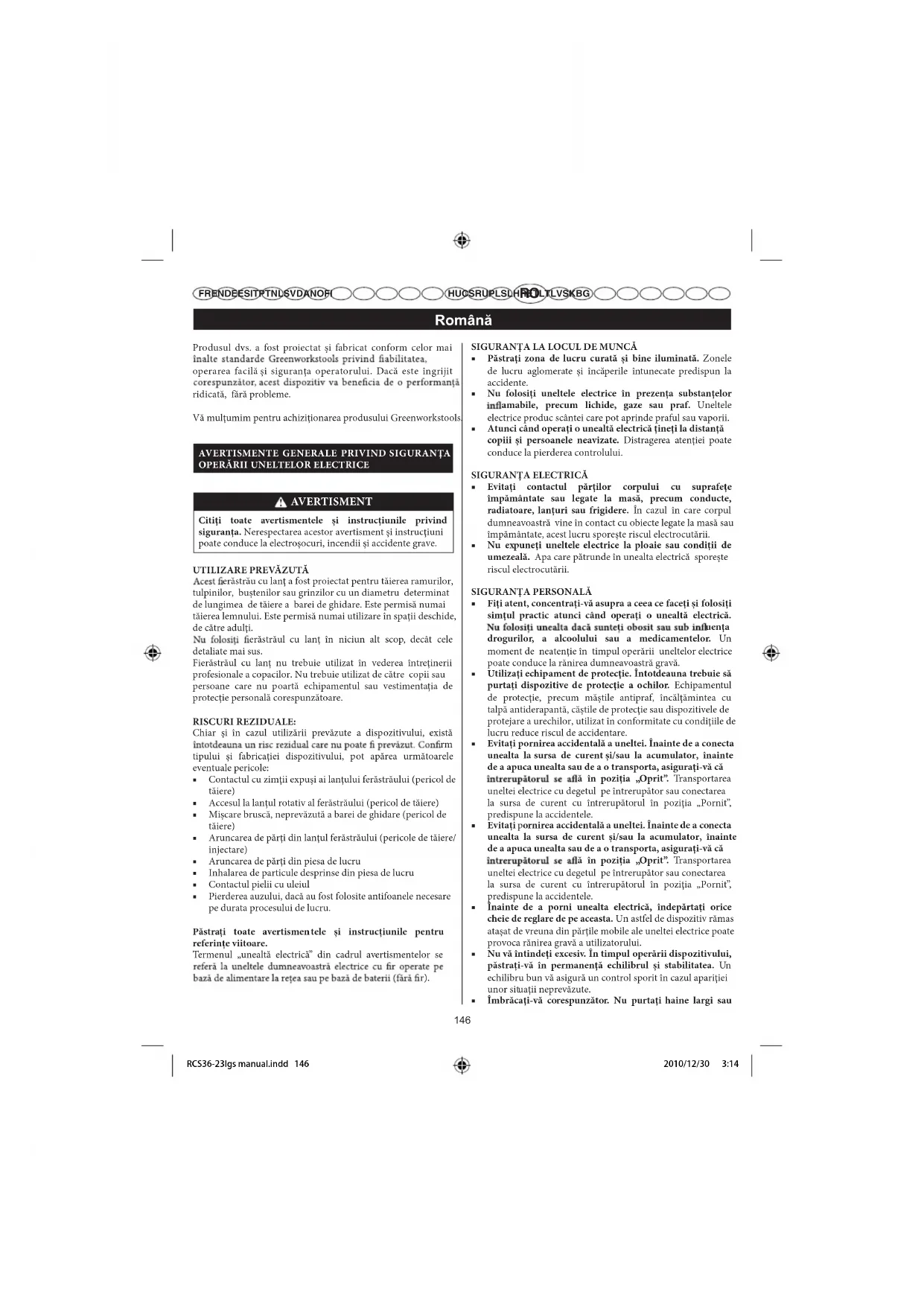 ■ Fiţi atent, concentraţi-vă asupra a ceea ce faceţi și folosiţi simţul practic atunci când operaţi o unealtă electrică. uenţa drogurilor, a alcoolului sau a medicamentelor. Un moment de neatenţie în timpul operării uneltelor electrice poate conduce la rănirea dumneavoastră gravă. ■ Utilizaţi echipament de protecţie. Întotdeauna trebuie să purtaţi dispozitive de protecţie a ochilor. Echipamentul de protecţie, precum măștile antipraf, încălţămintea cu talpă antiderapantă, căștile de protecţie sau dispozitivele de protejare a urechilor, utilizat în conformitate cu condiţiile de lucru reduce riscul de accidentare. ■ Evitaţi pornirea accidentală a uneltei. Înainte de a conecta unealta la sursa de curent și/sau la acumulator, înainte de a apuca unealta sau de a o transporta, asiguraţi-vă că ă în poziţia „Oprit”. Transportarea uneltei electrice cu degetul pe întrerupător sau conectarea la sursa de curent cu întrerupătorul în poziţia „Pornit”, predispune la accidentele. ■ Evitaţi pornirea accidentală a uneltei. Înainte de a conecta unealta la sursa de curent și/sau la acumulator, înainte de a apuca unealta sau de a o transporta, asiguraţi-vă că ă în poziţia „Oprit”. Transportarea uneltei electrice cu degetul pe întrerupător sau conectarea la sursa de curent cu întrerupătorul în poziţia „Pornit”, predispune la accidentele. ■ Înainte de a porni unealta electrică, îndepărtaţi orice cheie de reglare de pe aceasta. Un astfel de dispozitiv rămas atașat de vreuna din părţile mobile ale uneltei electrice poate provoca rănirea gravă a utilizatorului. ■ Nu vă întindeţi excesiv. În timpul operării dispozitivului, păstraţi-vă în permanenţă echilibrul și stabilitatea. Un echilibru bun vă asigură un control sporit în cazul apariţiei unor sit uaţii neprevăzute. ■ Îmbrăcaţi-vă corespunzător. Nu purtaţi haine largi sau RCS36-23lgs manual.indd 146 2010/12/30 3:14147 Română FR EN DE ES IT PT NL SV DA NO FI