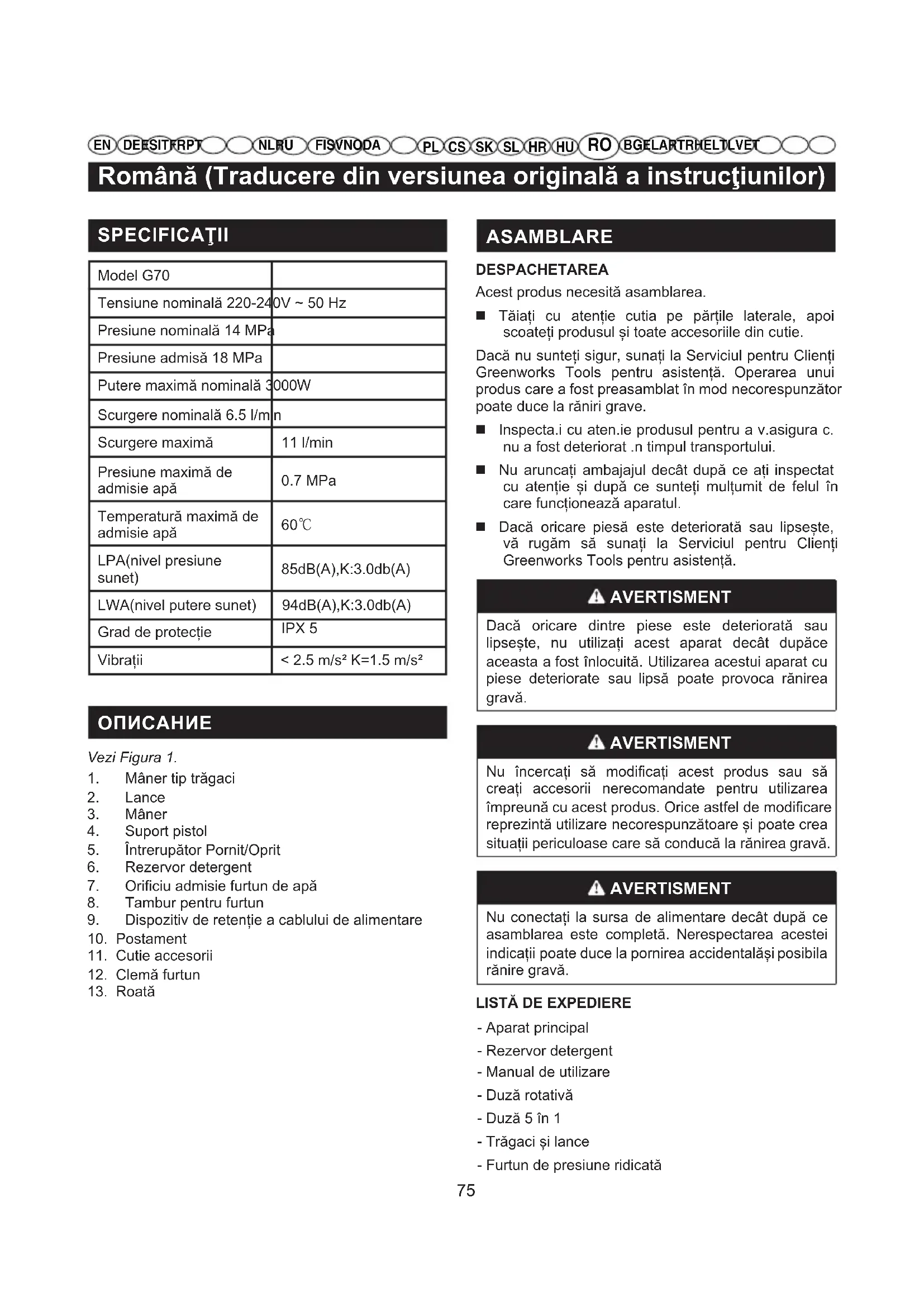 DE ES IT FR PTNL RUFI SV NO DA BG EL AR TR HE LT LV ET SPECIFICAŢII Model G70 Tensiune nominală 220-240V ~ 50 Hz Presiune nominală 14 MPa Presiune admisă 18 MPa Putere maximă nominală 3000W Scurgere nominală 6.5 l/min Scurgere maximă 11 l/min Presiune maximă de admisie apă