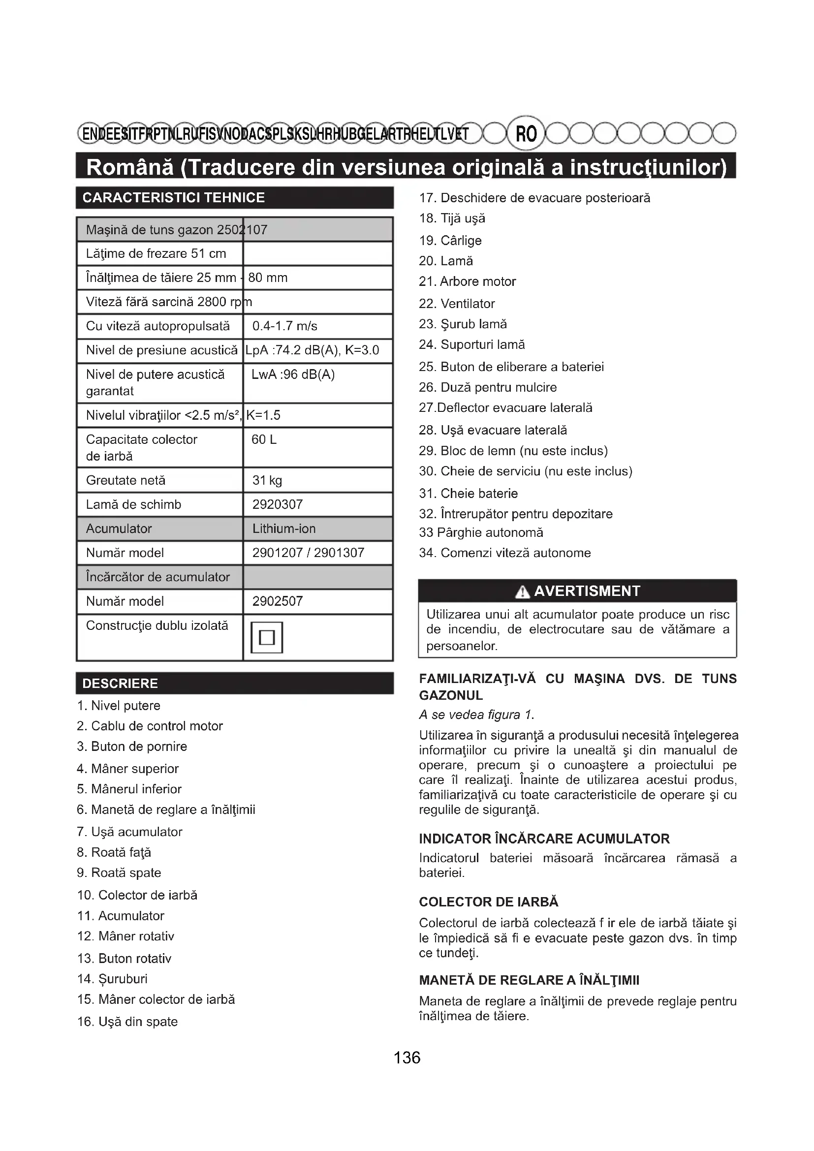 EN DE ES IT FR PT NL RU FI SV NO DA CS PL SK SL HR HU BG EL AR TR HE LT LV ET CARACTERISTICI TEHNICEMaşină de tuns gazon 2502107Lăţime de frezare 51 cmÎnălţimea de tăiere 25 mm - 80 mmViteză fără sarcină 2800 rpmCu viteză autopropulsată 0.4-1.7 m/sNivel de presiune acustică LpA :74.2 dB(A), K=3.0Nivel de putere acustică garantatLwA :96 dB(A)Nivelul vibraţiilor <2.5 m/s², K=1.5Capacitate colectorde iarbă 60 L Greutate netă 31 kgLamă de schimb 2920307Acumulator Lithium-ionNumăr model 2901207 / 2901307Încărcător de acumulatorNumăr model 2902507Construcţie dublu izolatăDESCRIERE1. Nivel putere2. Cablu de control motor3. Buton de pornire4. Mâner superior5. Mânerul inferior6. Manetă de reglare a înălţimii7. Uşă acumulator8. Roată faţă9. Roată spate10. Colector de iarbă11. Acumulator12. Mâner rotativ13. Buton rotativ14. Șuruburi15. Mâner colector de iarbă16. Uşă din spate17. Deschidere de evacuare posterioară18. Tijă uşă19. Cârlige20. Lamă21. Arbore motor22. Ventilator23. Şurub lamă24. Suporturi lamă25. Buton de eliberare a bateriei26. Duză pentru mulcire27.Deflector evacuare laterală28. Uşă evacuare laterală29. Bloc de lemn (nu este inclus)30. Cheie de serviciu (nu este inclus)31. Cheie baterie32. Întrerupător pentru depozitare33 Pârghie autonomă34. Comenzi viteză autonome AVERTISMENT Utilizarea unui alt acumulator poate produce un risc de incendiu, de electrocutare sau de vătămare a persoanelor. FAMILIARIZAŢI-VĂ CU MAŞINA DVS. DE TUNS GAZONULA se vedea gura 1.Utilizarea în siguranţă a produsului necesită înţelegerea informaţiilor cu privire la unealtă şi din manualul de operare, precum şi o cunoaştere a proiectului pe care îl realizaţi. Înainte de utilizarea acestui produs, familiarizaţivă cu toate caracteristicile de operare şi cu regulile de siguranţă.INDICATOR ÎNCĂRCARE ACUMULATOR Indicatorul bateriei măsoară încărcarea rămasă a bateriei.COLECTOR DE IARBĂ Colectorul de iarbă colectează f ir ele de iarbă tăiate şi le împiedică să e evacuate peste gazon dvs. în timp ce tundeţi.MANETĂ DE REGLARE A ÎNĂLŢIMIIManeta de reglare a înălţimii de prevede reglaje pentru înălţimea de tăiere. 136Română (Traducere din versiunea originală a instrucţiunilor)