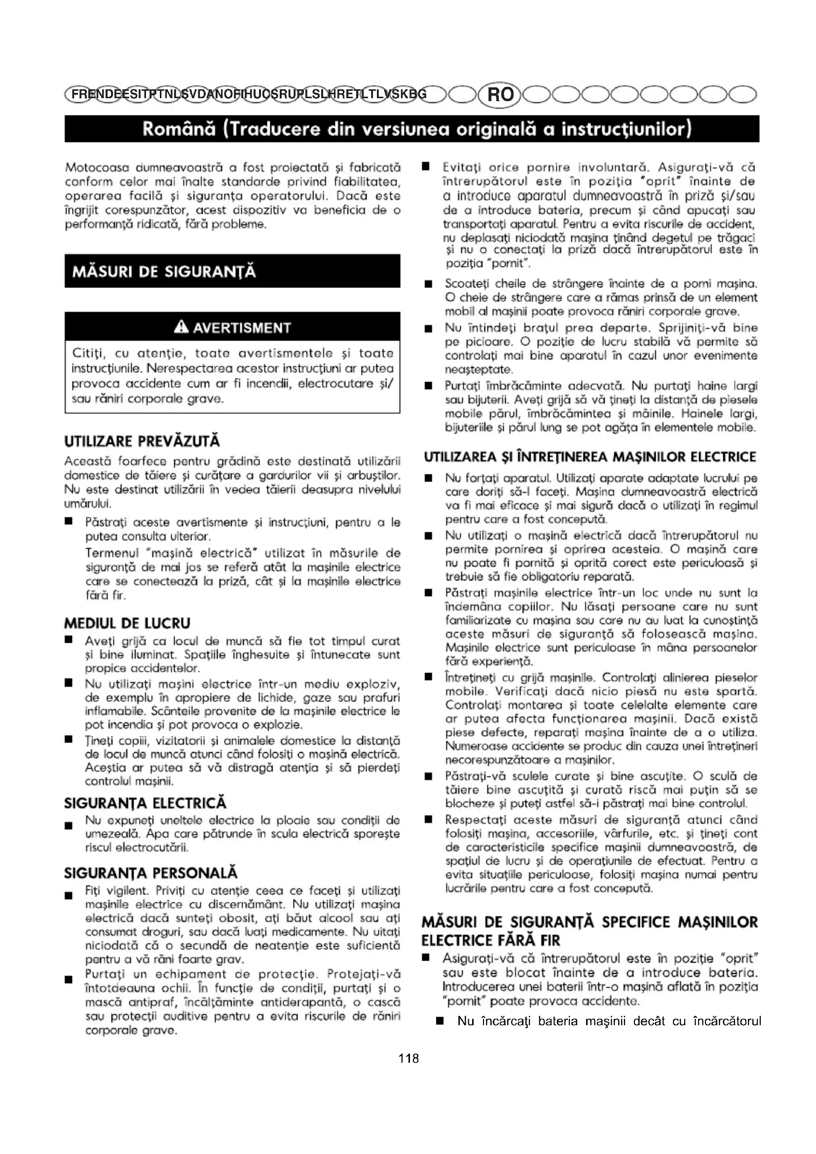 117RO FR EN DE ES IT PT NL SV DA NO FI HU CS RU PL SL HR ET LT LV SK BG Nu încărcaţi bateria maşinii decât cu încărcătorul 118RO FR EN DE ES IT PT NL SV DA NO FI HU CS RU PL SL HR ET LT LV SK BG recomandat de producător. Un încărcător adaptat la un anumit tip de baterie poate declanşa un incendiu dacă este utilizat cu un alt tip de baterie. Pentru o maşină fără fir trebuie să utilizaţi numai un tip de baterie specific. Utilizarea altor tipuri de baterie poate provoca incendii. Când bateria nu este utilizată, ţineţi-o la distanţă de obiectele metalice cum ar fi agrafe de birou, monezi, chei, şuruburi, cuie sau orice alt obiect susceptibil de a face scurtcircuit între bornele bateriei. Scurtcircuitarea bornelor bateriei poate provoca arsuri sau incendii. Evitaţi orice contact cu lichidul din baterie în caz de scurgere a bateriei datorată unei utilizări abuzive. În caz de contact cu lichidul, spălaţi imediat zona atinsă cu apă curată.Dacă vă sunt atinşi ochii, consultaţi de asemenea un medic. Lichidul proiectat dintr-o baterie poate provoca iritaţii sau arsuri. ÎNTREŢINERE Orice reparaţie trebuie să fie efectuată de către un tehnician calificat, utilizând numai piese de schimb originale. Veţi putea astfel să vă utilizaţi maşina electrică în deplină siguranţă. AVERTIZĂRI DE SIGURANŢĂ A MAŞINII DE TUNS