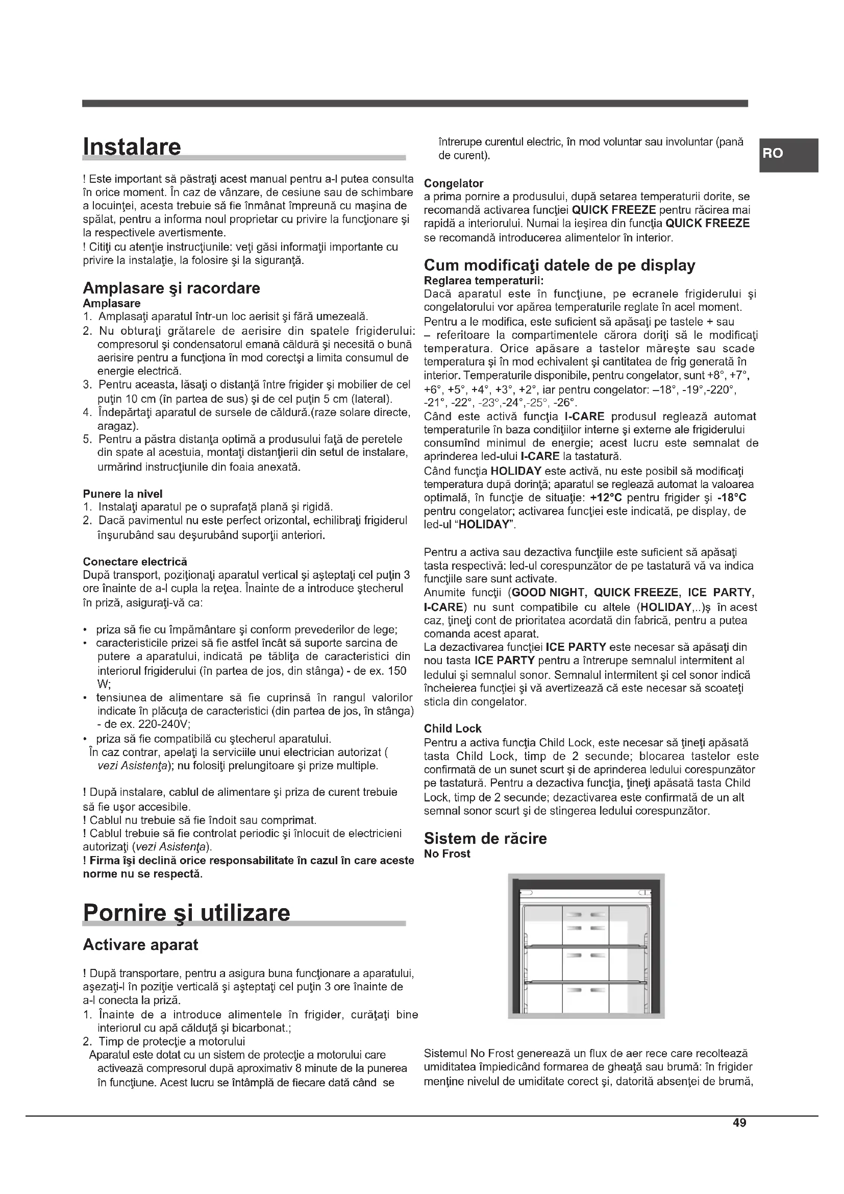 Aparatul este dotat cu un sistem de protecţie a motorului care activează compresorul după aproximativ 8 minute de la punerea în funcţiune. Acest lucru se întâmplă de ecare dată când se întrerupe curentul electric, în mod voluntar sau involuntar (pană de curent). Congelator a prima pornire a produsului, după setarea temperaturii dorite, se recomandă activarea funcţiei QUICK FREEZE pentru răcirea mai rapidă a interiorului. Numai la ieşirea din funcţia QUICK FREEZE se recomandă introducerea alimentelor în interior. Cum modicaţi datele de pe display Reglarea temperaturii: Dacă aparatul este în funcţiune, pe ecranele frigiderului şi congelatorului vor apărea temperaturile reglate în acel moment. Pentru a le modica, este sucient să apăsaţi pe tastele + sau – referitoare la compartimentele cărora doriţi să le modicaţi temperatura. Orice apăsare a tastelor măreşte sau scade temperatura şi în mod echivalent şi cantitatea de frig generată în interior. Temperaturile disponibile, pentru congelator, sunt +8°, +7°, +6°, +5°, +4°, +3°, +2°, iar pentru congelator: –18°, -19°,-220°, -21°, -22°, -23°,-24°,-25°, -26°. Când este activă funcţia I-CARE produsul reglează automat temperaturile în baza condiţiilor interne şi externe ale frigiderului consumînd minimul de energie; acest lucru este semnalat de aprinderea led-ului I-CARE la tastatură. Când funcţia HOLIDAY este activă, nu este posibil să modicaţi temperatura după dorinţă; aparatul se reglează automat la valoarea optimală, în funcţie de situaţie: +12°C pentru frigider şi -18°C pentru congelator; activarea funcţiei este indicată, pe display, de led-ul “HOLIDAY”. Pentru a activa sau dezactiva funcţiile este sucient să apăsaţi tasta respectivă: led-ul corespunzător de pe tastatură vă va indica funcţiile sare sunt activate. Anumite funcţii (GOOD NIGHT, QUICK FREEZE, ICE PARTY, I-CARE) nu sunt compatibile cu altele (HOLIDAY,..)ş în acest caz, ţineţi cont de prioritatea acordată din fabrică, pentru a putea comanda acest aparat. La dezactivarea funcţiei ICE PARTY este necesar să apăsaţi din nou tasta ICE PARTY pentru a întrerupe semnalul intermitent al ledului şi semnalul sonor. Semnalul intermitent şi cel sonor indică încheierea funcţiei şi vă avertizează că este necesar să scoateţi sticla din congelator. Child Lock Pentru a activa funcţia Child Lock, este necesar să ţineţi apăsată tasta Child Lock, timp de 2 secunde; blocarea tastelor este conrmată de un sunet scurt şi de aprinderea ledului corespunzător pe tastatură. Pentru a dezactiva funcţia, ţineţi apăsată tasta Child Lock, timp de 2 secunde; dezactivarea este conrmată de un alt semnal sonor scurt şi de stingerea ledului corespunzător. Sistem de răcire No Frost Sistemul No Frost generează un ux de aer rece care recoltează umiditatea împiedicând formarea de gheaţă sau brumă: în frigider menţine nivelul de umiditate corect şi, datorită absenţei de brumă,50