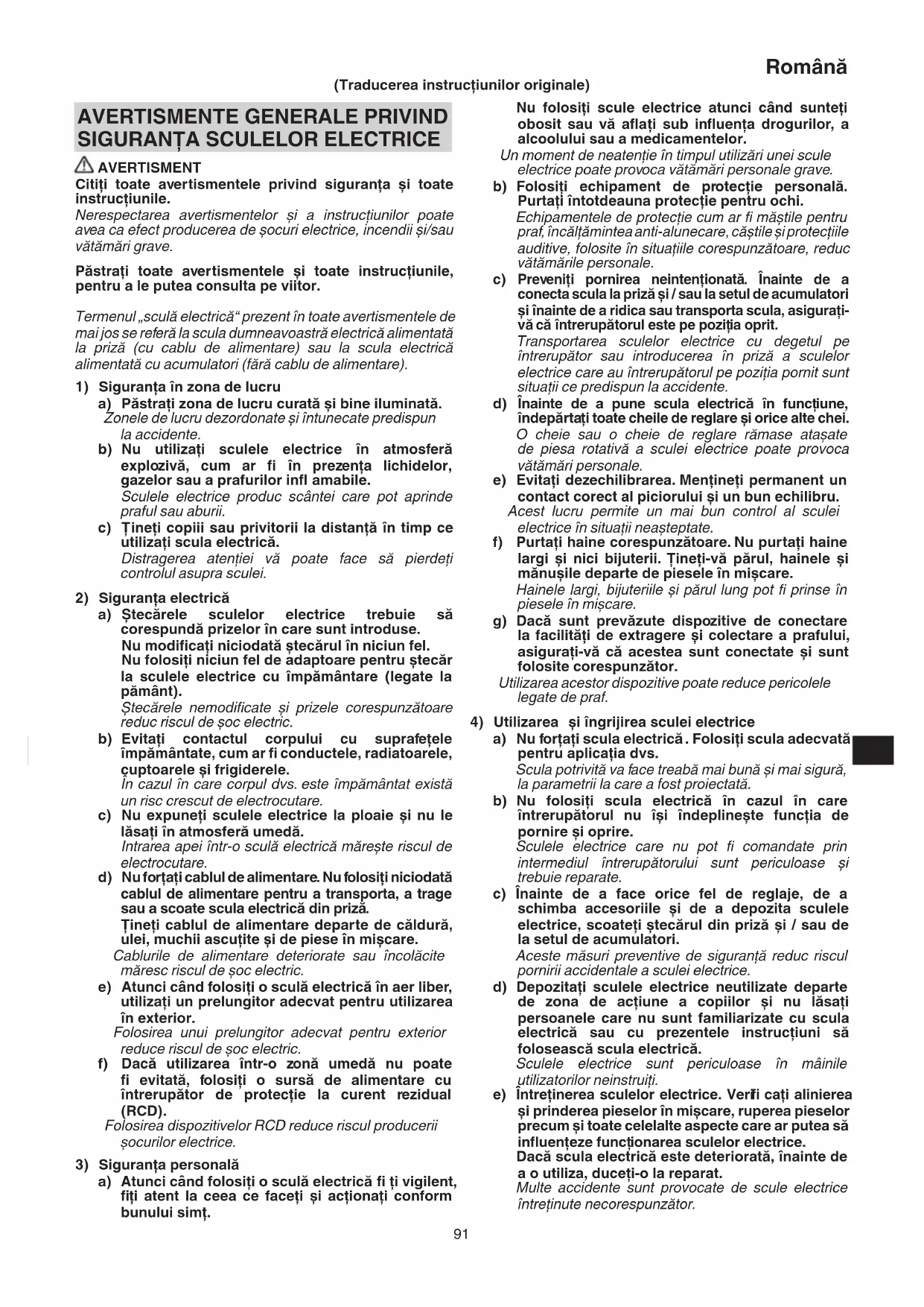 a) Atunci când folosiţi o sculă electrică fi ţi vigilent, fi ţi atent la ceea ce faceţi și acţionaţi conform bunului simţ. (Traducerea instrucţiunilor originale) 0000BookG18SH2.indb910000BookG18SH2.indb91 2016/06/2316:47:542016/06/2316:47:5492 Română f) Păstraţi elementele de tăiere curate și ascuţite. Elementele de tăiere bine întreţinute și cu muchiile de tăiere bine ascuţite sunt mai ușor de controlat și este mai puţin probabil să se agaţe. g) Folosiţi scula electrică, accesoriile și vârfurile etc. în conformitate cu prezentele instrucţiuni, luând în considerare condiţiile de lucru și operaţiunile ce urmează a fi efectuate. Folosirea sculei electrice pentru alte operaţiuni decât cele prevăzute poate avea ca efect apariţia unor situaţii periculoase.