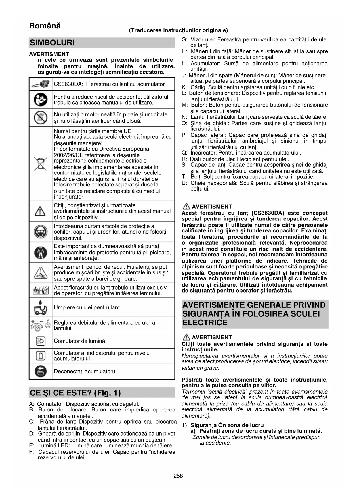 a) Încărcaţi numai cu încărcătorul indicat de producător. Un încărcător adecvat unui anumit tip de pachet de acumulatori poate prezenta pericol de incendiu dacă este folosit pentru încărcarea altui tip de pachet de acumulatori. 000BookCS3630DA.indb259000BookCS3630DA.indb259 2019/07/2917:50:082019/07/2917:50:08260 Română b) Folosiţi sculele electrice exclusiv cu tipurile de pachete de acumulatori indicate. Folosirea unui alt tip de pachet de acumulatori poate provoca vătămări sau incendii. c) Atunci când pachetul de acumulatori nu este folosit, ţineţi-l departe de obiecte metalice cum ar fi agrafe de birou, monede, chei, cuie, șuruburi sau alte obiecte metalice mici care ar putea realiza conectarea terminalelor pachetului de acumulatori. Scurtcircuitarea terminalelor acumulatorilor poate provoca arsuri sau incendii. d) În cazul exploatării abuzive, din acumulatori poate ieși lichid; evitaţi contactul cu acest lichid. În cazul unui contact accidental, spălaţi cu apă. În cazul contactului cu ochii, consultaţi un medic. Lichidul care iese din acumulatori poate provoca iritaţii sau arsuri.