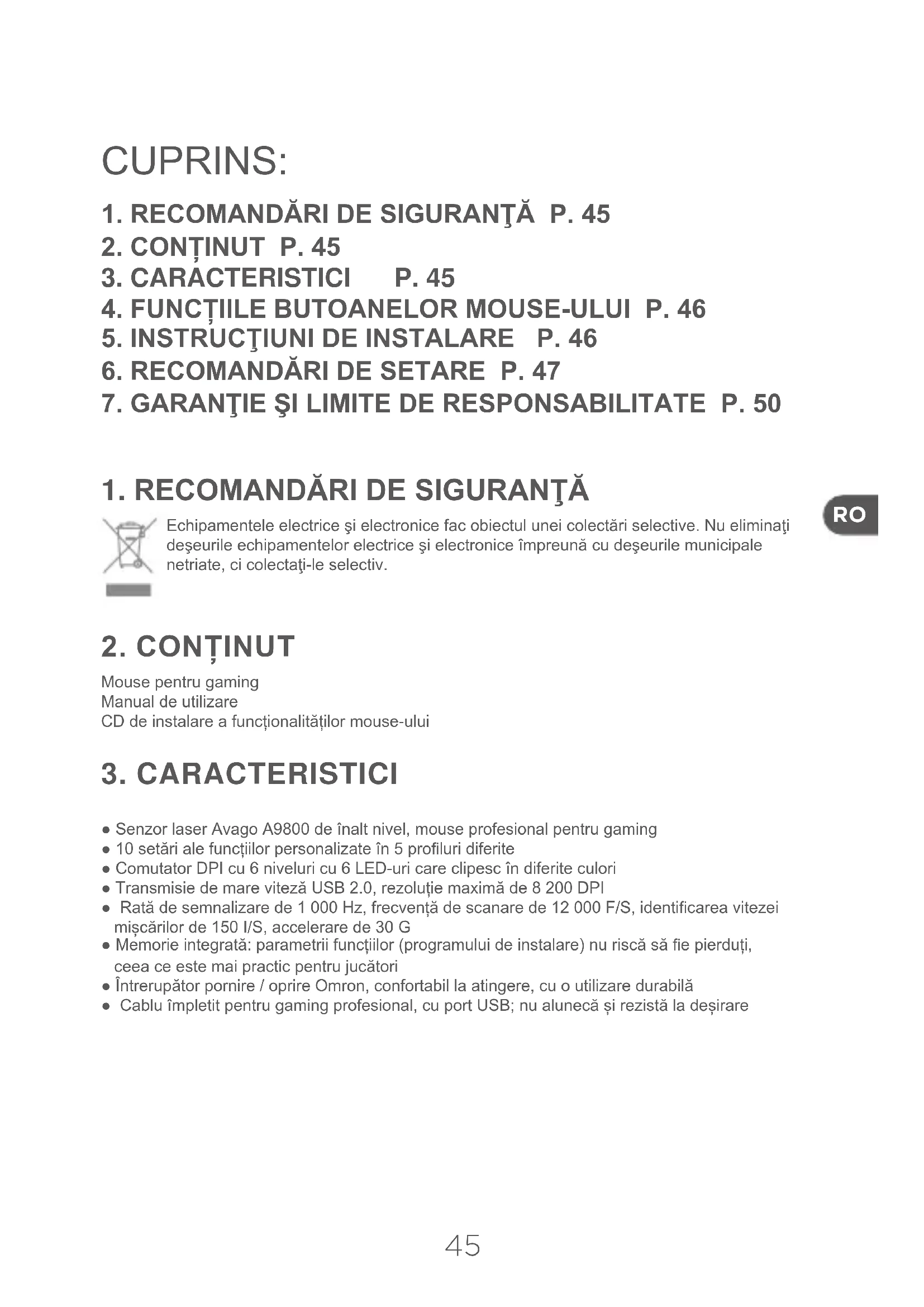 ● Senzor laser Avago A9800 de înalt nivel, mouse profesional pentru gaming ● 10 setări ale funcțiilor personalizate în 5 proluri diferite ● Comutator DPI cu 6 niveluri cu 6 LED-uri care clipesc în diferite culori ● Transmisie de mare viteză USB 2.0, rezoluție maximă de 8 200 DPI ● Rată de semnalizare de 1 000 Hz, frecvență de scanare de 12 000 F/S, identicarea vitezei mișcărilor de 150 I/S, accelerare de 30 G ● Memorie integrată: parametrii funcțiilor (programului de instalare) nu riscă să e pierduți, ceea ce este mai practic pentru jucători ● Întrerupător pornire / oprire Omron, confortabil la atingere, cu o utilizare durabilă ● Cablu împletit pentru gaming profesional, cu port USB; nu alunecă și rezistă la deșirareRO