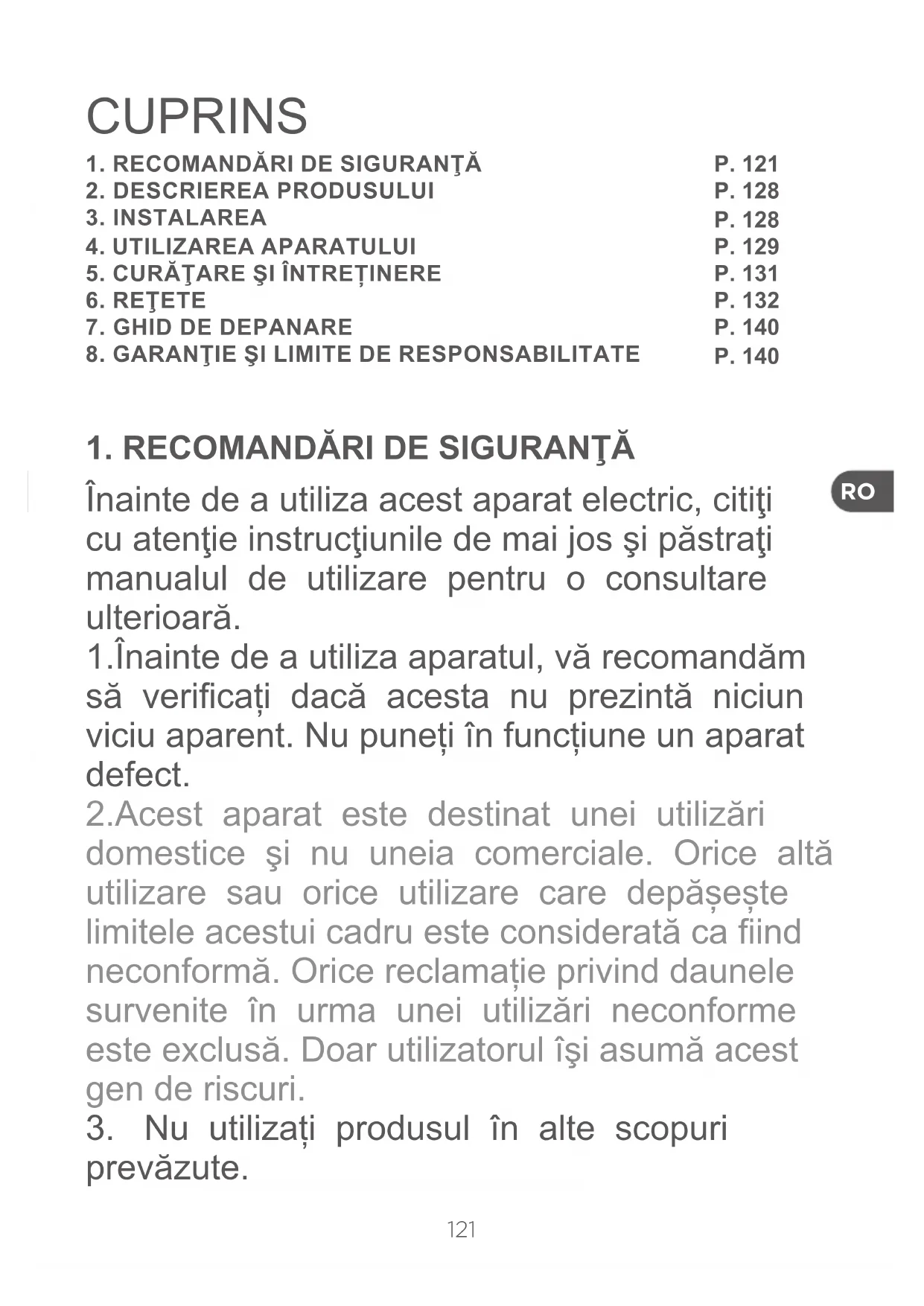 Înainte de a utiliza acest aparat electric, citiţi cu atenţie instrucţiunile de mai jos şi păstraţi manualul de utilizare pentru o consultare ulterioară. 1.Înainte de a utiliza aparatul, vă recomandăm să vericați dacă acesta nu prezintă niciun viciu aparent. Nu puneți în funcțiune un aparat defect. 2.Acest aparat este destinat unei utilizări domestice şi nu uneia comerciale. Orice altă utilizare sau orice utilizare care depășește limitele acestui cadru este considerată ca ind neconformă. Orice reclamație privind daunele survenite în urma unei utilizări neconforme este exclusă. Doar utilizatorul îşi asumă acest gen de riscuri.