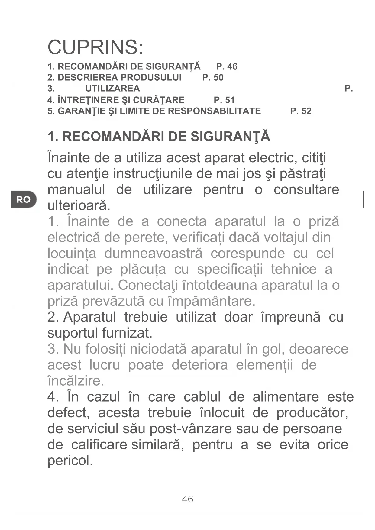 RO5. Deconectaţi cablul de alimentare de la reţeaua electrică atunci când nu mai folosiţi produsul, precum şi înainte de orice operaţiune de curăţare, de întreţinere sau de montare a accesoriilor.