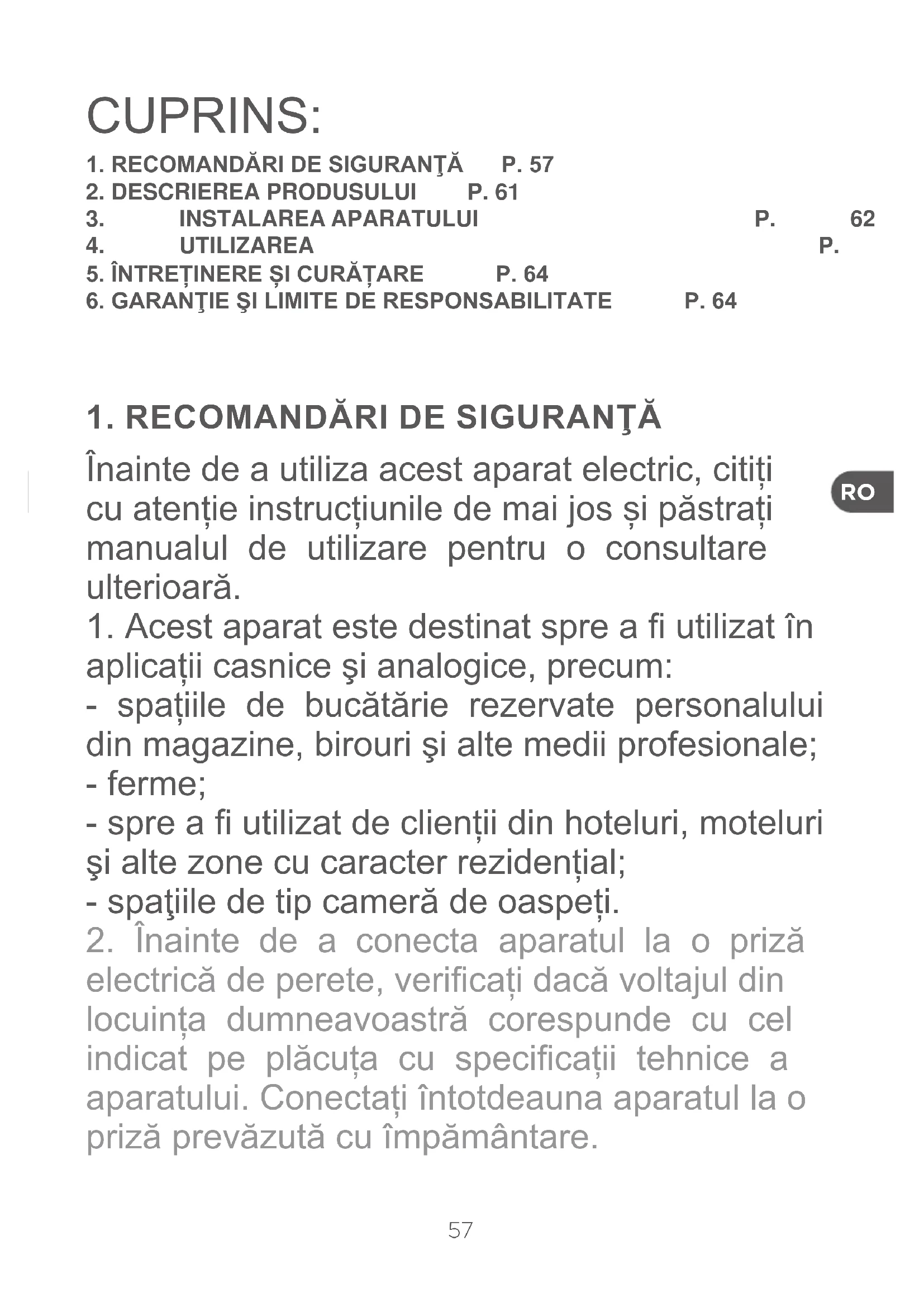 electrică de perete, vericați dacă voltajul din locuința dumneavoastră corespunde cu cel indicat pe plăcuța cu specicații tehnice a aparatului. Conectați întotdeauna aparatul la o priză prevăzută cu împământare. CUPRINS: