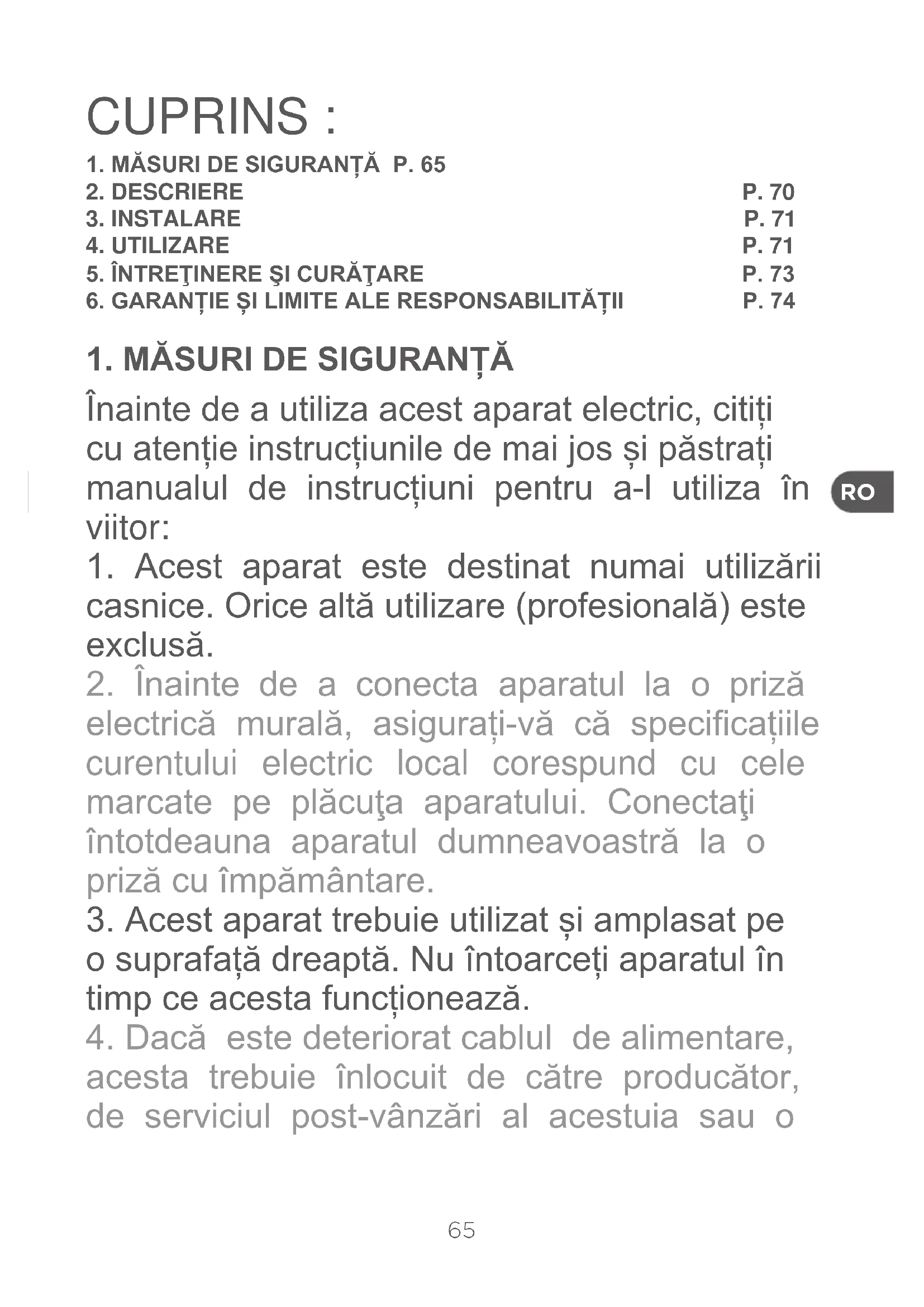 RO25. Nu utilizați aparatul mai mult de 1 minut încontinuu. Lăsați aparatul oprit cel puțin 1 minut între 2 cicluri de funcționare.