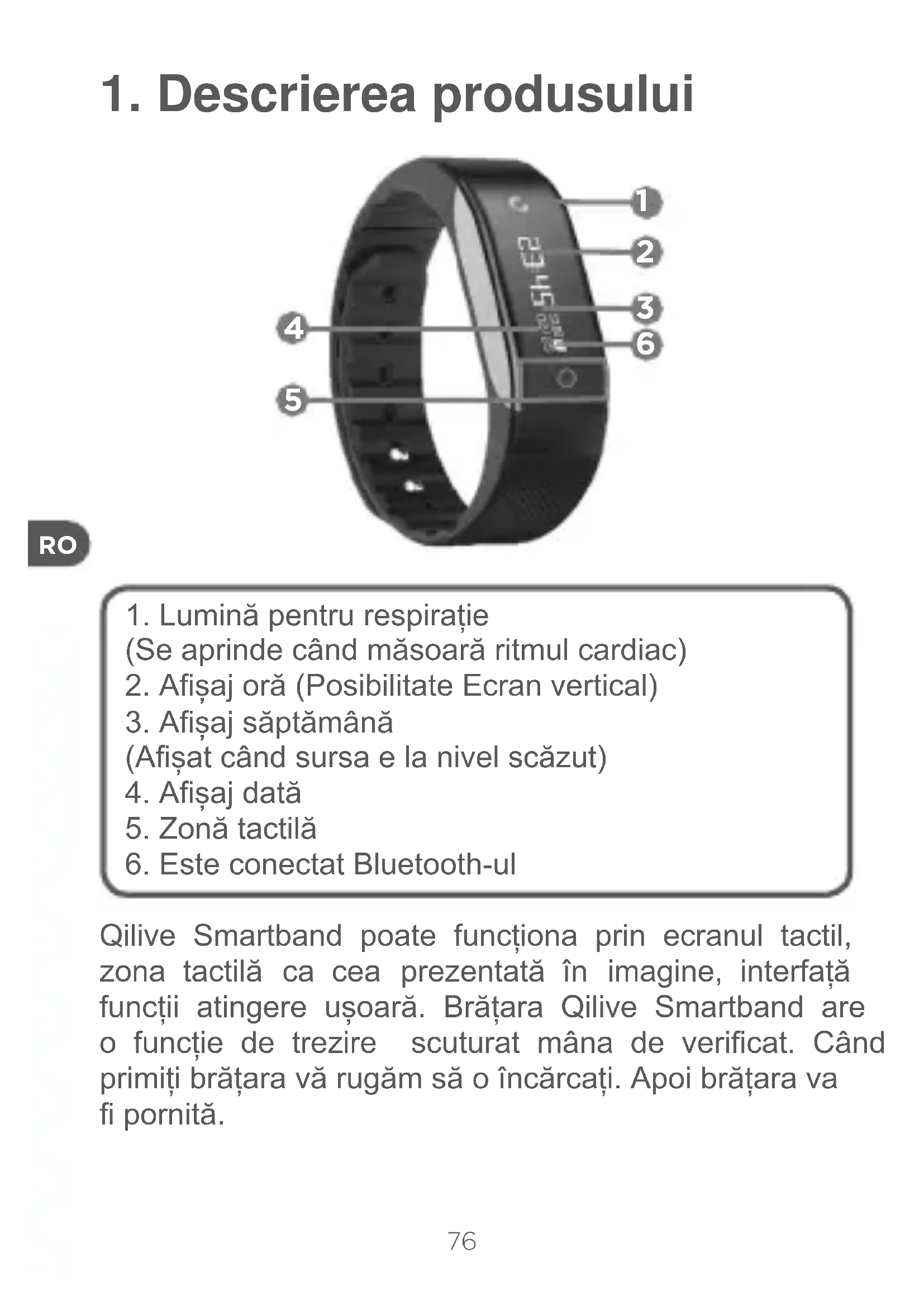 Qilive Smartband poate funcționa prin ecranul tactil, zona tactilă ca cea prezentată în imagine, interfață funcții atingere ușoară. Brățara Qilive Smartband are o funcție de trezire scuturat mâna de vericat. Când primiți brățara vă rugăm să o încărcați. Apoi brățara va pornită.77