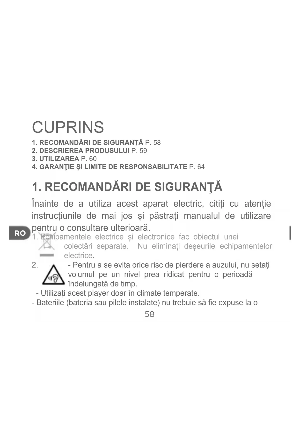 - Pentru a se evita orice risc de pierdere a auzului, nu setați volumul pe un nivel prea ridicat pentru o perioadă îndelungată de timp. - Utilizați acest player doar în climate temperate. - Bateriile (bateria sau pilele instalate) nu trebuie să e expuse la oRO