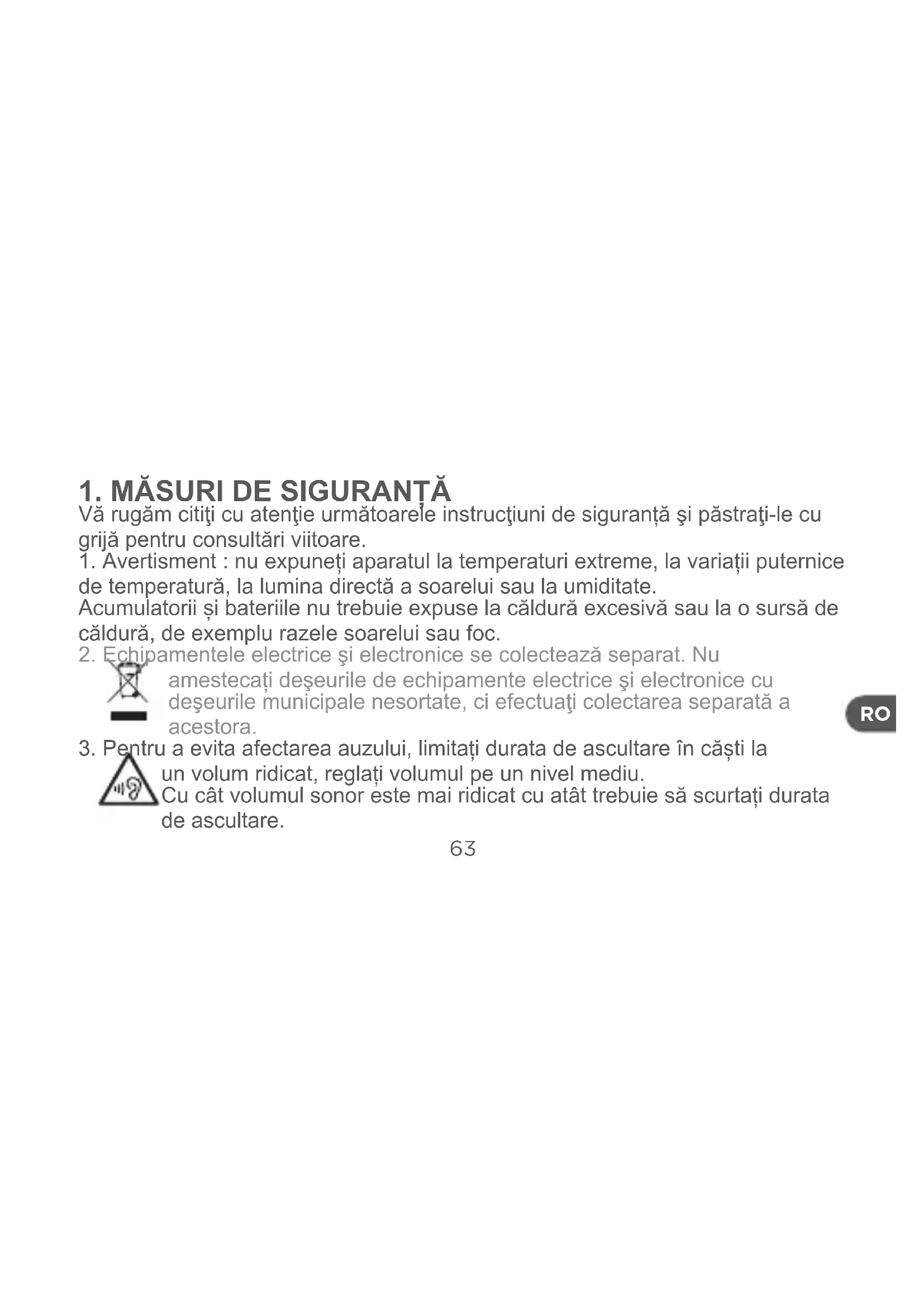 un volum ridicat, reglați volumul pe un nivel mediu. Cu cât volumul sonor este mai ridicat cu atât trebuie să scurtați durata de ascultare.RO