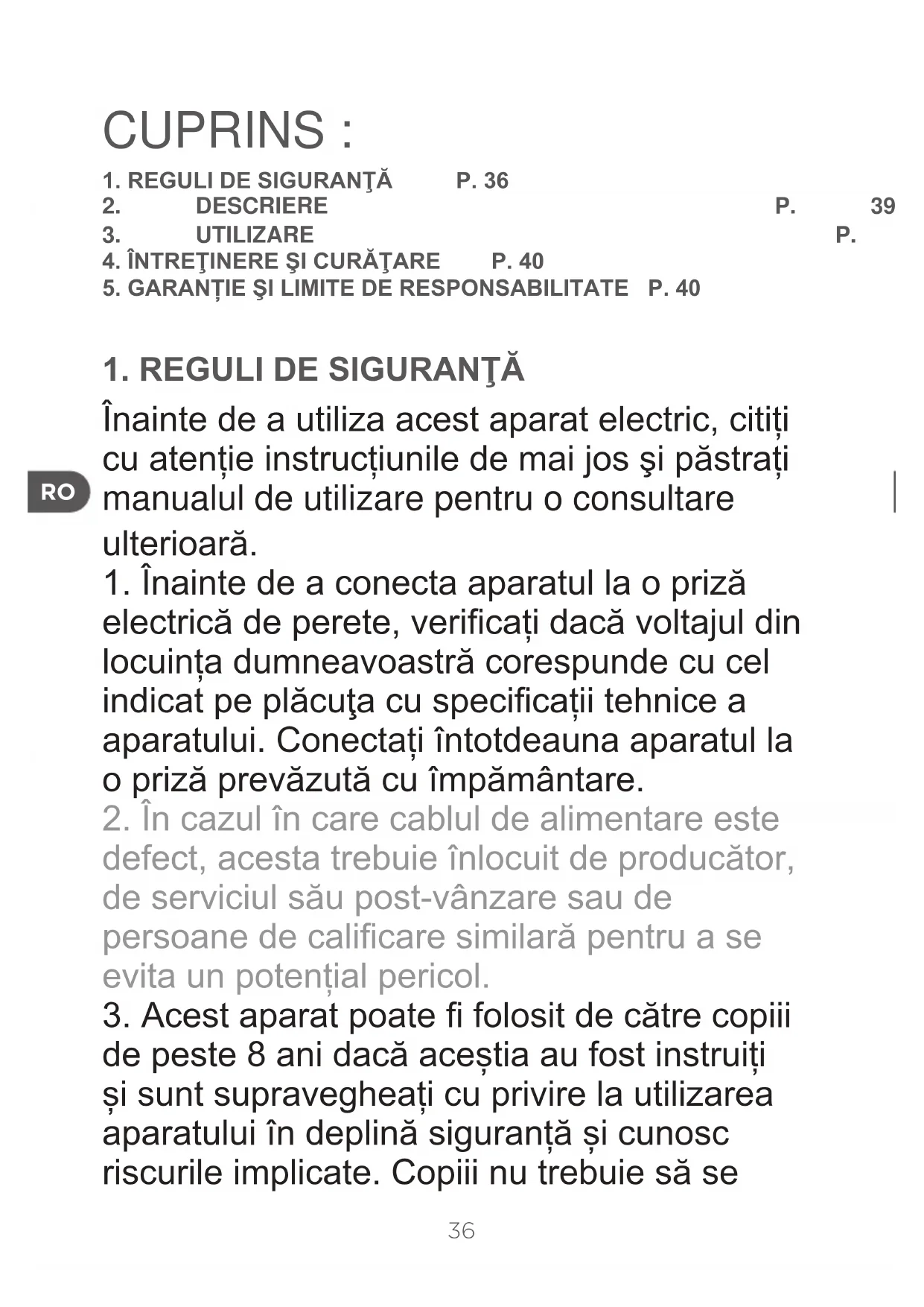 joace cu aparatul. Curățarea și întreținerea de către utilizator nu trebuie efectuate de către copii, numai dacă au peste 8 ani și sunt supravegheați. Nu lăsați aparatul și cablul acestuia la îndemâna copiilor sub 8 ani. Acest aparat poate utilizat de către persoane cu capacităţi zice, senzoriale sau intelectuale reduse, sau de persoane lipsite de experienţă sau cunoştinţe, cu condiţia ca acestea să benecieze de supraveghere sau de instruire cu privire la utilizarea aparatului în deplină siguranţă şi înţeleg bine pericolele potenţiale. Vă recomandăm să supravegheați copiii pentru ca aceștia să nu se joace cu aparatul