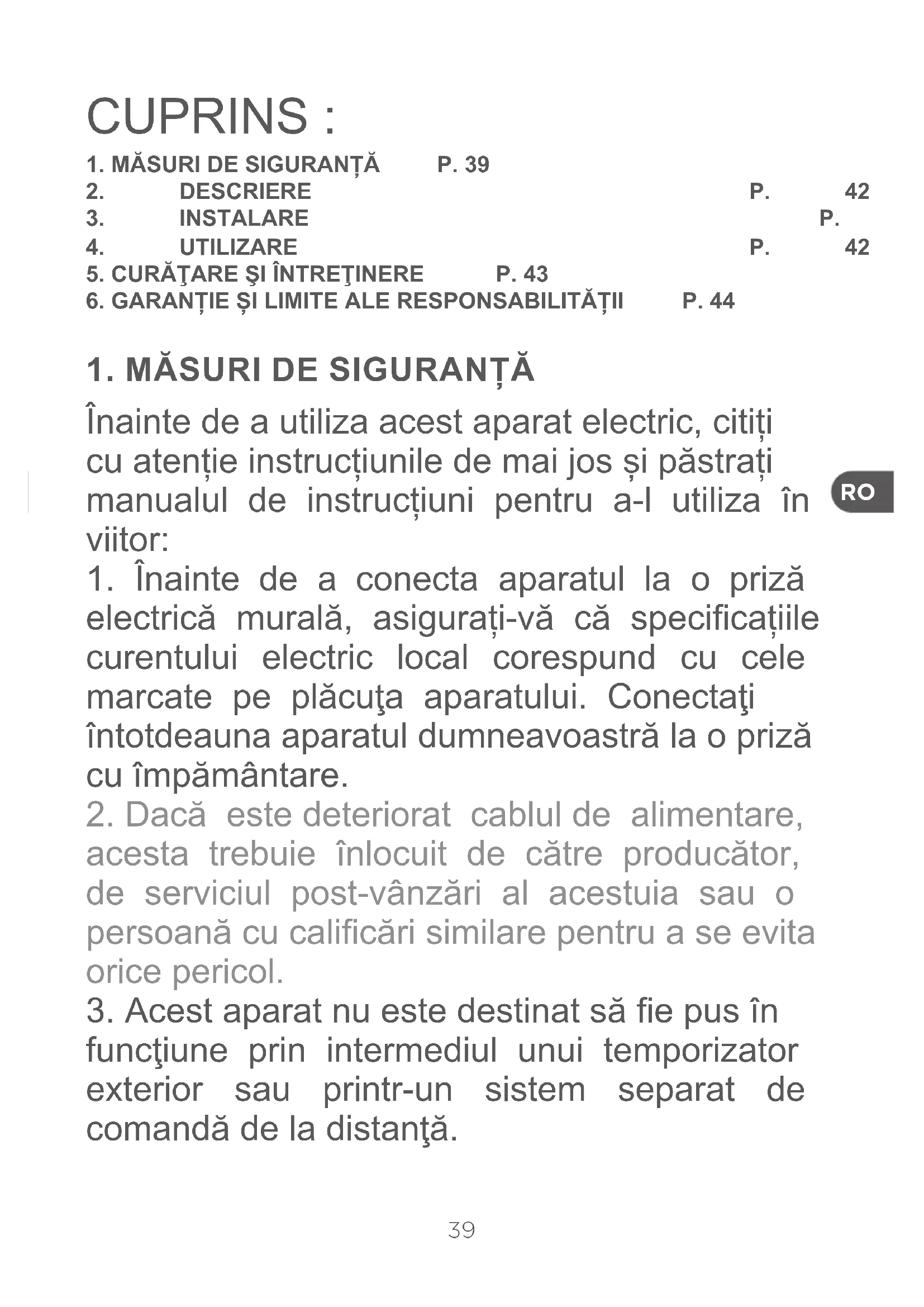 Înainte de a utiliza acest aparat electric, citiți cu atenție instrucțiunile de mai jos și păstrați manualul de instrucțiuni pentru a-l utiliza în viitor:
