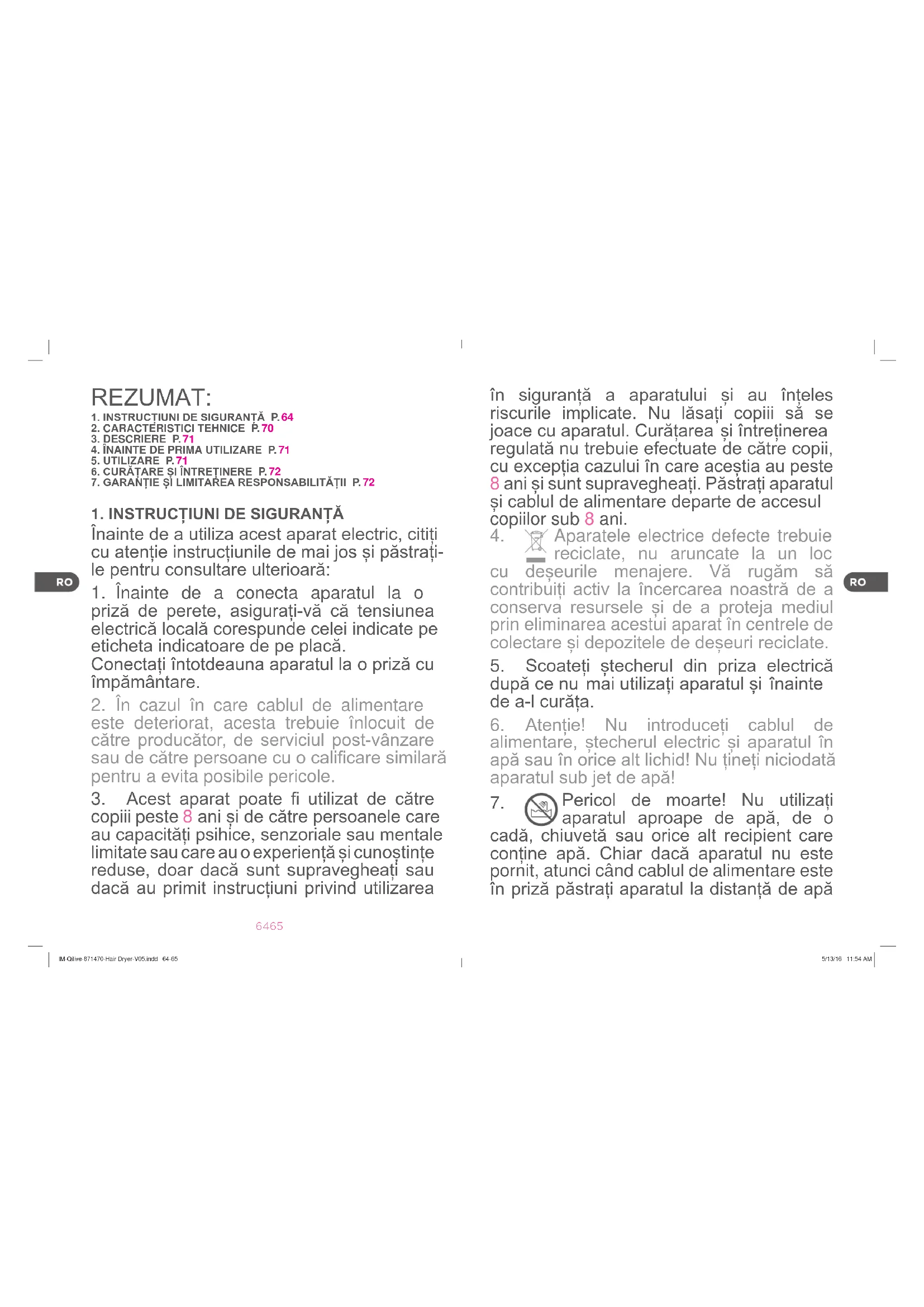 Pericol de moarte! Nu utilizați aparatul aproape de apă, de o cadă, chiuvetă sau orice alt recipient care conține apă. Chiar dacă aparatul nu este pornit, atunci când cablul de alimentare este în priză păstrați aparatul la distanță de apă IM-Qilive-871470-Hair Dryer-V05.indd 64-65 5/13/16 11:54 AM66 67 și de orice alt lichid.