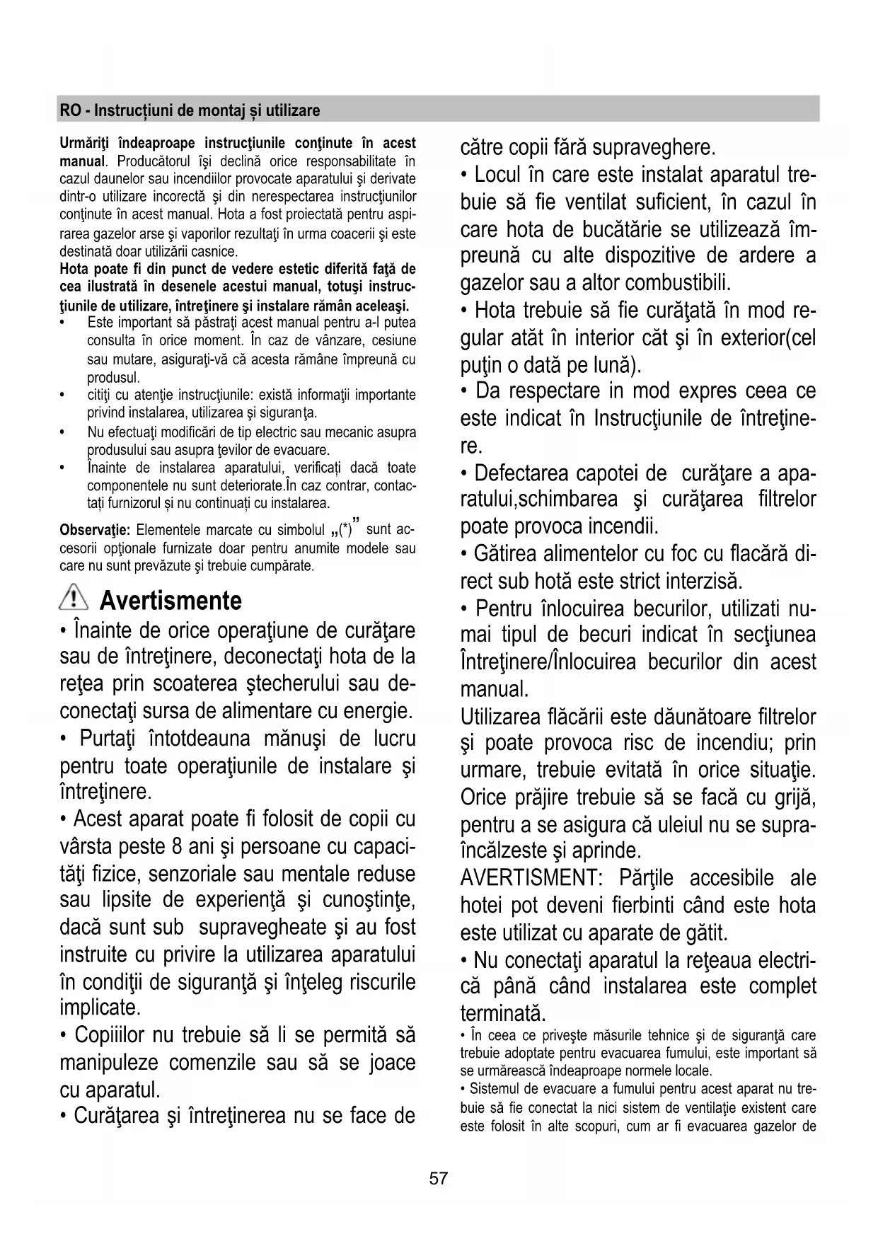 Монтирайте отново решетката. Ако ел. крушките не светят, проверете дали са монтирани правилно преди да потърсите помощта на специалист.57 RO - Instrucțiuni de montaj și utilizare Urmăriţi îndeaproape instrucţiunile conţinute în acest manual. Producătorul îşi declină orice responsabilitate în cazul daunelor sau incendiilor provocate aparatului şi derivate dintr-o utilizare incorectă şi din nerespectarea instrucţiunilor conţinute în acest manual. Hota a fost proiectată pentru aspi- rarea gazelor arse şi vaporilor rezultaţi în urma coacerii şi este destinată doar utilizării casnice. Hota poate fi din punct de vedere estetic diferită faţă de cea ilustrată în desenele acestui manual, totuşi instruc- ţiunile de utilizare, întreţinere şi instalare rămân aceleaşi.