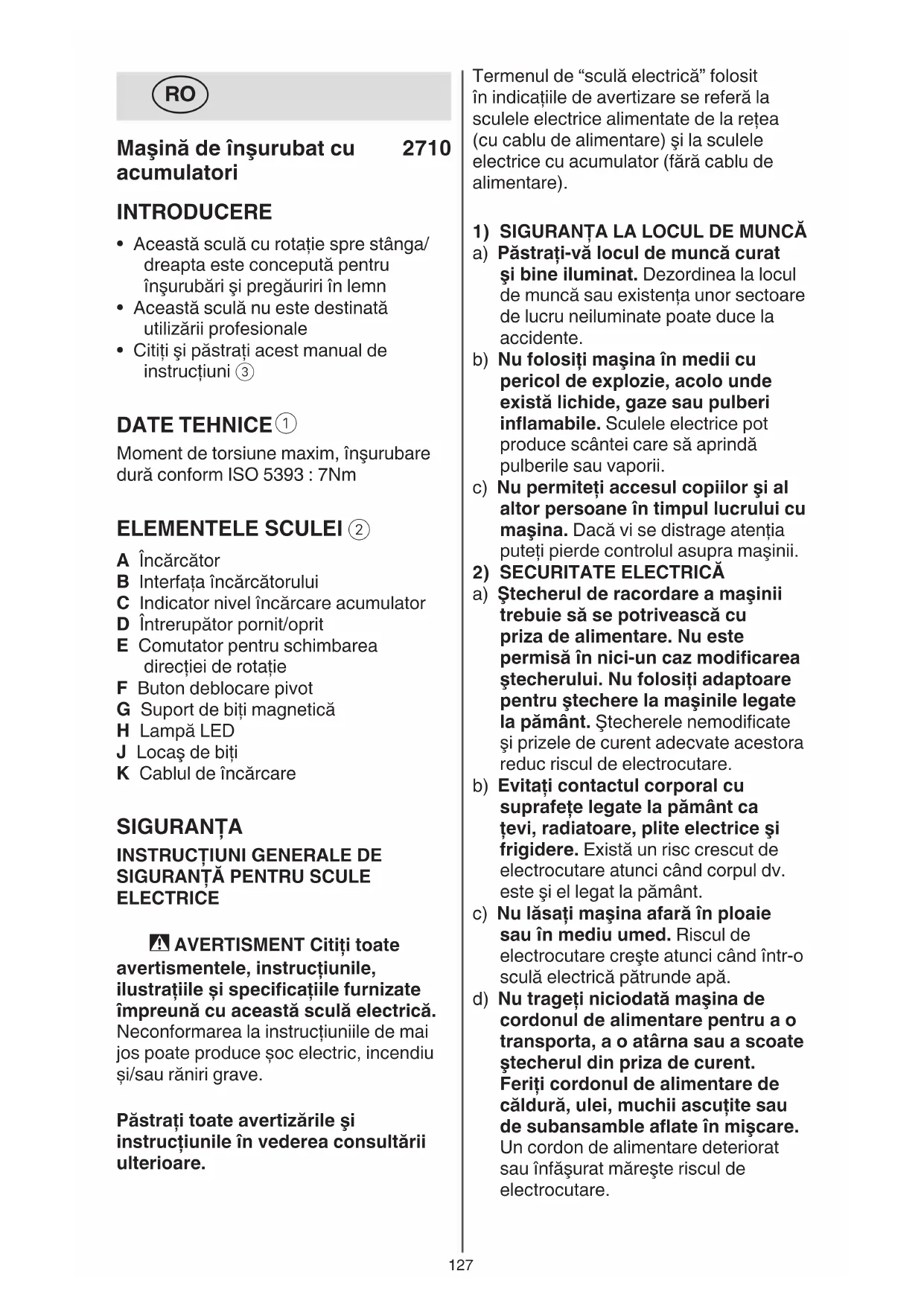 A Încărcător B Interfaţa încărcătorului C Indicator nivel încărcare acumulator D Întrerupător pornit/oprit E Comutator pentru schimbarea direcţiei de rotaţie F Buton deblocare pivot G Suport de biţi magnetică H Lampă LED J Locaş de biţi K Cablul de încărcare SIGURANŢA