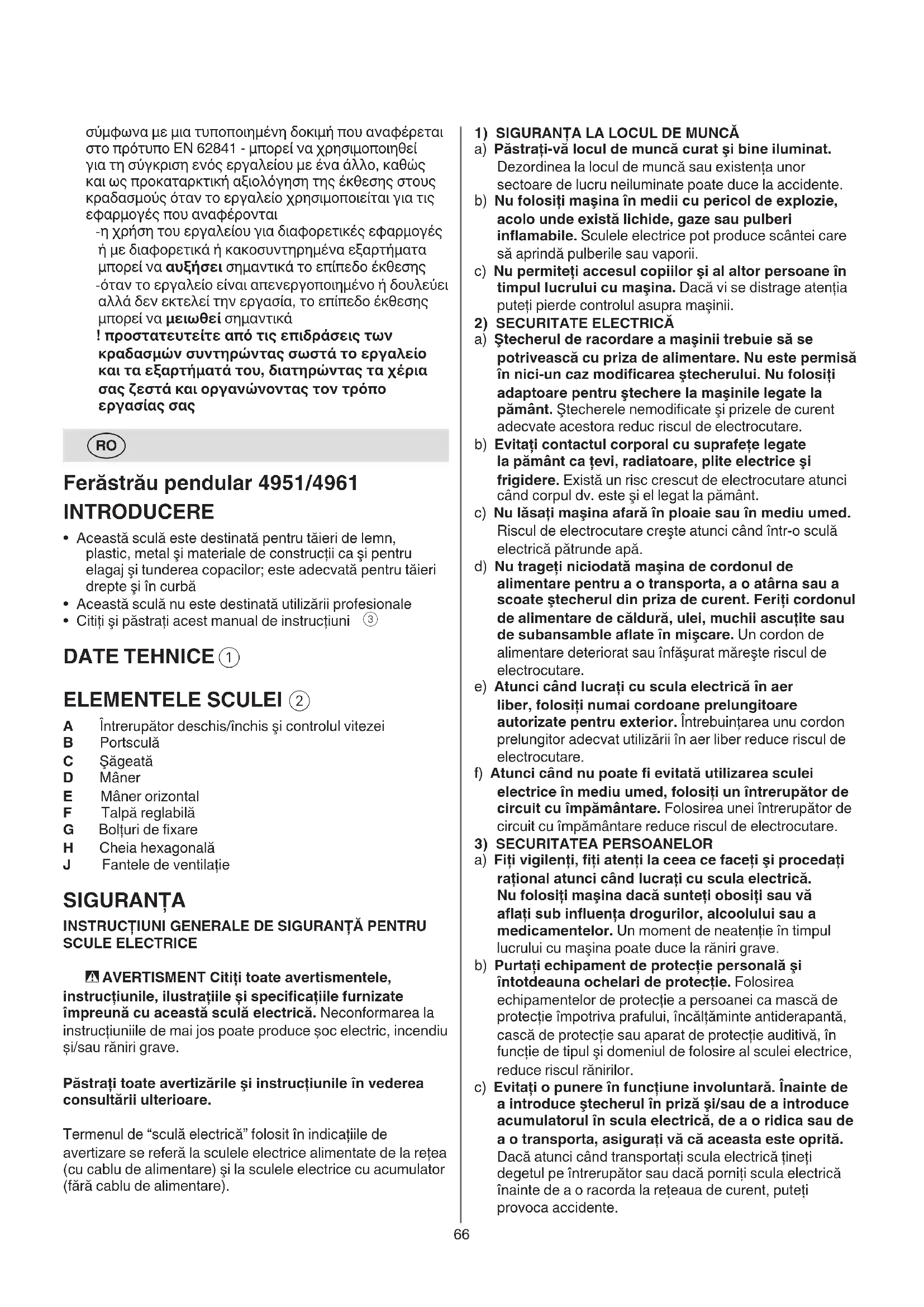 ELECTRICE a) Nu suprasolicitaţi maşina. Folosiţi scula electrică destinată executării lucrării dumneavoastră. Cu scula electrică potrivită lucraţi mai bine şi mai sigur în domeniul de putere specicat. b) Nu folosiţi scula electrică dacă are întrerupătorul defect. O sculă electrică, care nu mai poate pornită sau oprită este periculoasă şi trebuie reparată. c) Scoateţi ştecherul afară din priză şi/sau îndepărtaţi acumulatoru dacă este detaşabil, înainte de a executa reglaje, a schimba accesorii sau a depozita scula electrică. Această măsură preventivă reduce riscul unei porniri involuntare a maşinii. d) În caz de nefolosire păstraţi maşinile la loc inaccesibil copiilor. Nu permiteţi persoanelor care nu sunt familiarizate cu maşina sau care n-au citit prezentele instrucţiuni, să folosească maşina. Sculele electrice sunt periculoase atunci când sunt folosite de persoane fără experienţă. e) Întreţineţi sculele electrice şi accesoriile acestora. Controlaţi dacă componentele mobile funcţionează corect şi dacă nu se blochează, dacă nu există piese defecte sau deteriorate, care să afecteze funcţionarea maşinii. Înainte de a repune în funcţiune maşina, duceţi-o la un atelier de asistenţă service pentru repararea sau înlocuirea pieselor deteriorate. Multe accidente s-au datorat întreţinerii defectuoase a sculelor electrice. f) Păstraţi accesoriile bine ascuţite şi curate. Accesoriile atent întreţinute, cu muchii tăietoare bine ascuţite se blochează mai greu şi pot conduse mai uşor. g) Folosiţi sculele electrice, accesoriile, dispozitivele de lucru etc. conform prezentelor instrucţiuni. Ţineţi seama de condiţiile de lucru şi de lucrarea care trebuie executată. Întrebuinţarea unor scule electrice destinate altor utilizări decât cele preconizate, poate duce la situaţii periculoase. h) Menţineţi mânerele şi zonele de prindere uscate, curate şi feriţi-le de ulei şi unsoare. Mânerele şi zonele de prindere alunecoase nu permit manevrarea şi68 ! asiguraţi-vă că pânza de ferăstrău trece dincolo de piesa de prelucrat în timpul cursei