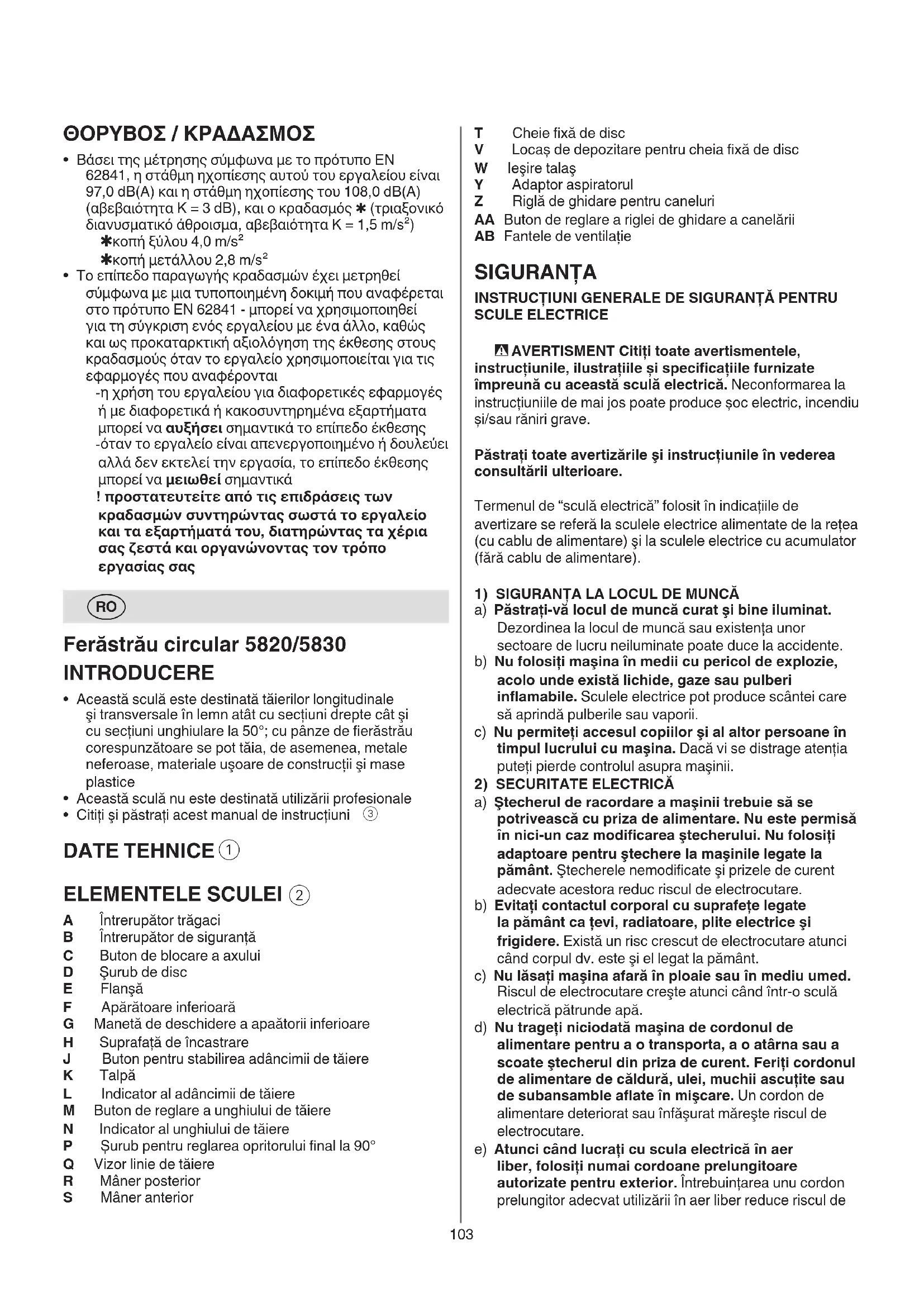 A Întrerupător trăgaci B Întrerupător de siguranţă C Buton de blocare a axului D Şurub de disc E Flanşă F Apărătoare inferioară G Manetă de deschidere a apaătorii inferioare H Suprafaţă de încastrare J Buton pentru stabilirea adâncimii de tăiere K Talpă L Indicator al adâncimii de tăiere M Buton de reglare a unghiului de tăiere N Indicator al unghiului de tăiere P Șurub pentru reglarea opritorului nal la 90° Q Vizor linie de tăiere R Mâner posterior S Mâner anterior104 d) În caz de nefolosire păstrați maşinile la loc inaccesibil copiilor. Nu permiteți persoanelor care nu sunt familiarizate cu maşina sau care n-au citit prezentele instrucțiuni, să folosească maşina. Sculele electrice sunt periculoase atunci când sunt folosite de persoane fără experienţă. e) Întrețineți sculele electrice şi accesoriile acestora. Controlați dacă componentele mobile funcționează corect şi dacă nu se blochează, dacă nu există piese defecte sau deteriorate, care să afecteze funcționarea maşinii. Înainte de a repune în funcțiune maşina, duceți-o la un atelier de asistență service pentru repararea sau înlocuirea pieselor deteriorate. Multe accidente s-au datorat întreţinerii defectuoase a sculelor electrice. f) Păstrați accesoriile bine ascuțite şi curate. Accesoriile atent întreţinute, cu muchii tăietoare bine ascuţite se blochează mai greu şi pot conduse mai uşor. g) Folosiți sculele electrice, accesoriile, dispozitivele de lucru etc. conform prezentelor instrucțiuni. Ţineți seama de condițiile de lucru şi de lucrarea care trebuie executată. Întrebuinţarea unor scule electrice destinate altor utilizări decât cele preconizate, poate duce la situaţii periculoase. h) Mențineți mânerele şi zonele de prindere uscate, curate şi feriți-le de ulei şi unsoare. Mânerele şi zonele de prindere alunecoase nu permit manevrarea şi controlul sigur al sculei electrice în situaţii neaşteptate.