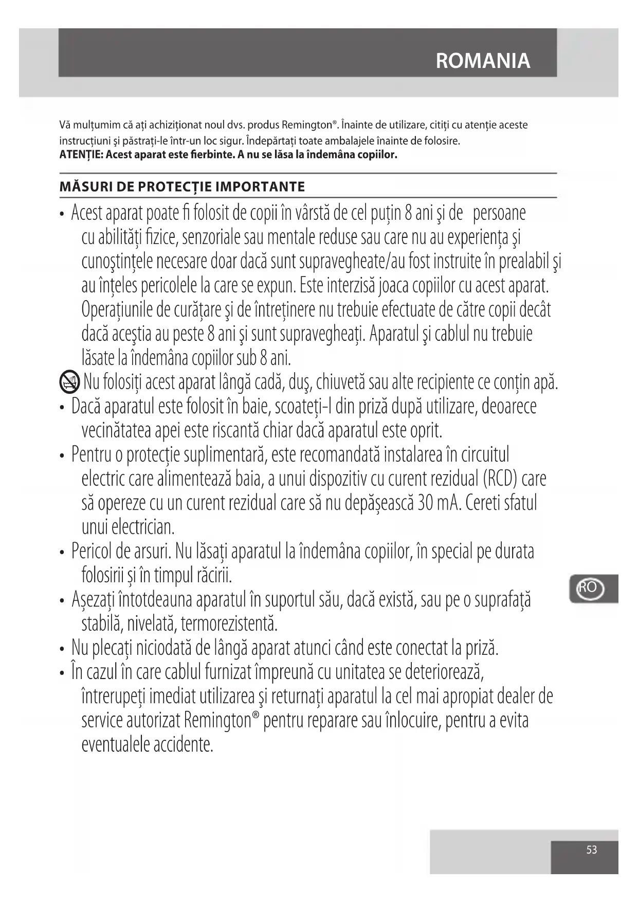 - În cazul în care cablul furnizat împreună cu unitatea se deteriorează, întrerupeţi imediat utilizarea şi returnaţi aparatul la cel mai apropiat dealer de service autorizat Remington® pentru reparare sau înlocuire, pentru a evita eventualele accidente. ROMANIA