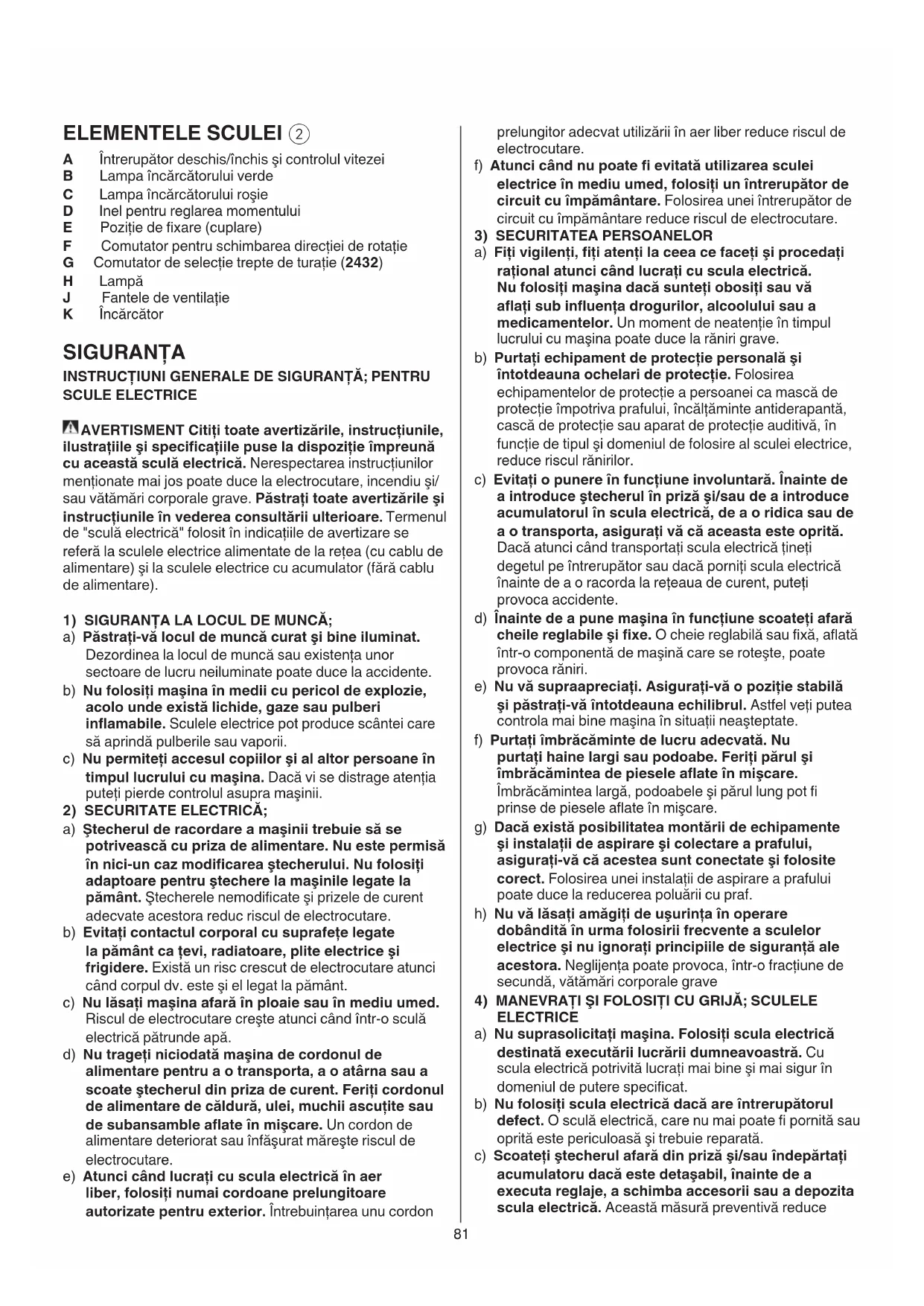 A Întrerupător deschis/închis şi controlul vitezei B Lampa încărcătorului verde C Lampa încărcătorului roşie D Inel pentru reglarea momentului E Poziţie de xare (cuplare) F Comutator pentru schimbarea direcţiei de rotaţie G Comutator de selecţie trepte de turaţie (2432) H Lampă J Fantele de ventilaţie K Încărcător SIGURANŢA