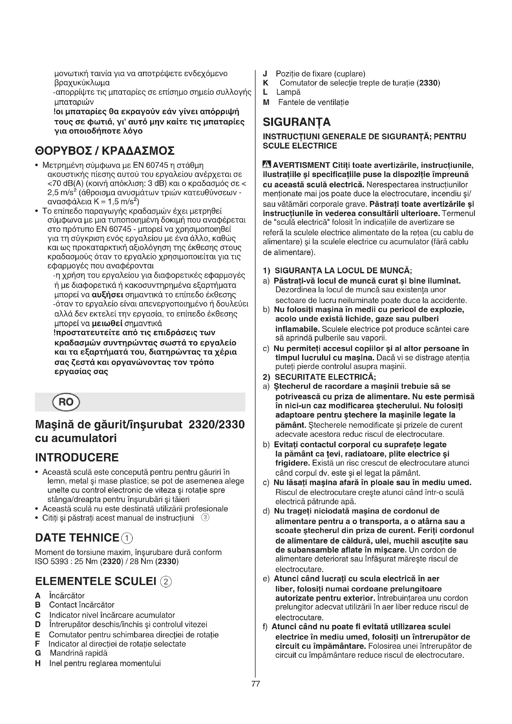 (2330) - setaţi comutatorul K la viteza dorită ! acţionaţi comutatorul de selecţie a treptelor de turaţie în timp ce scula funcţionează lent LOW - viteză scăzută - moment de rotaţie mare - pentru ghidarea şuruburilor şi pentru găuriri de diametre mari81 ЕЛЕМЕНТИ НА ИНСТРУМЕНТА