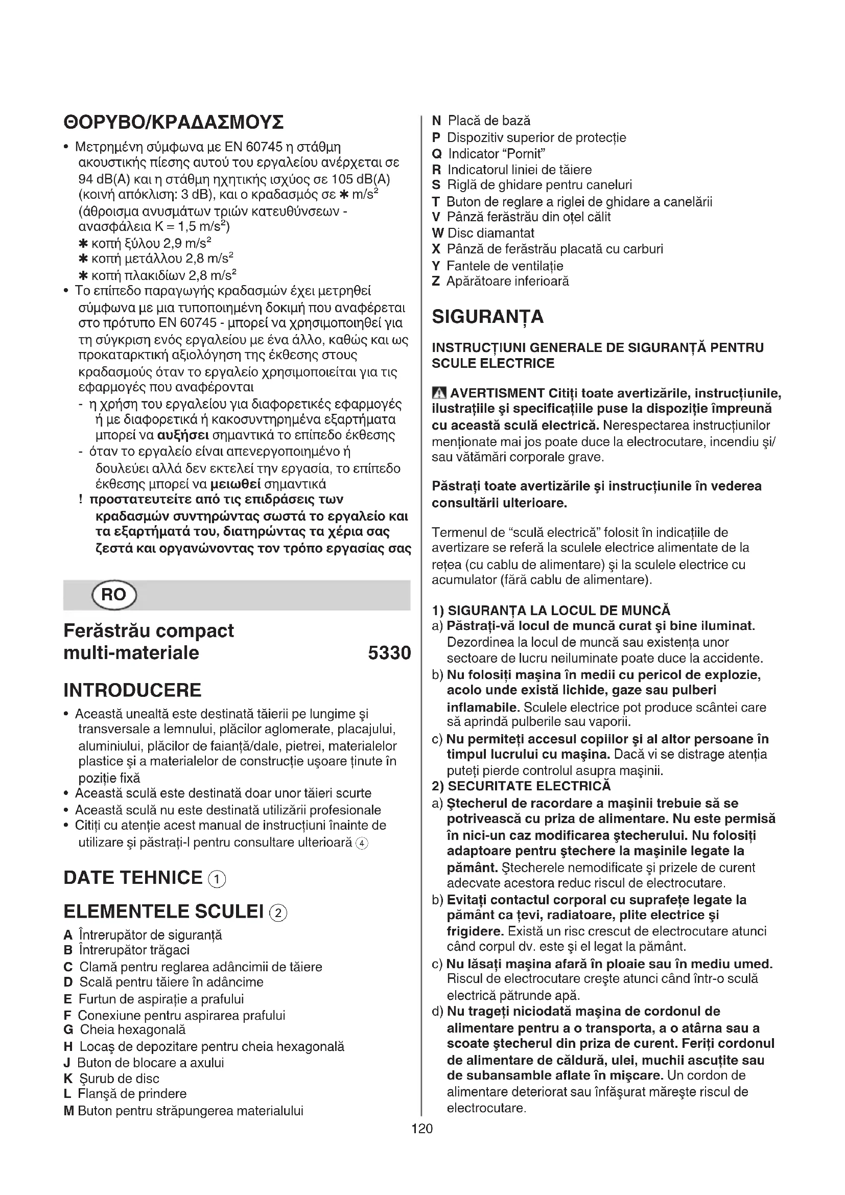 - Citiţi cu atenţie acest manual de instrucţiuni înainte de utilizare şi păstraţi-l pentru consultare ulterioară 4 DATE TEHNICE 1 ELEMENTELE SCULEI 2 A Întrerupător de siguranţă B Întrerupător trăgaci C Clamă pentru reglarea adâncimii de tăiere D Scală pentru tăiere în adâncime E Furtun de aspiraţie a prafului F Conexiune pentru aspirarea prafului G Cheia hexagonală H Locaş de depozitare pentru cheia hexagonală J Buton de blocare a axului K Şurub de disc L Flanşă de prindere M Buton pentru străpungerea materialului N Placă de bază P Dispozitiv superior de protecţie Q Indicator “Pornit” R Indicatorul liniei de tăiere S Riglă de ghidare pentru caneluri T Buton de reglare a riglei de ghidare a canelării V Pânză ferăstrău din oţel călit W Disc diamantat X Pânză de ferăstrău placată cu carburi Y Fantele de ventilaţie Z Apărătoare inferioară SIGURANŢA