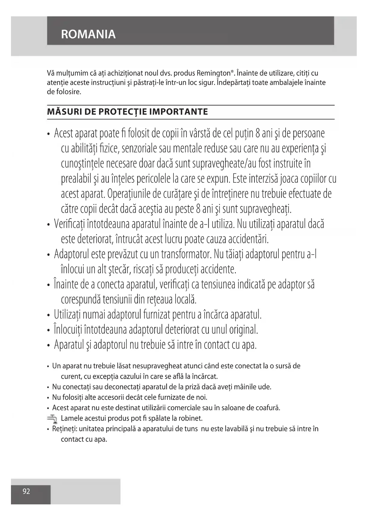 AE92 Vă mulţumim că aţi achiziţionat noul dvs. produs Remington®. Înainte de utilizare, citiţi cu atenţie aceste instrucţiuni şi păstraţi-le într-un loc sigur. Îndepărtaţi toate ambalajele înainte de folosire.