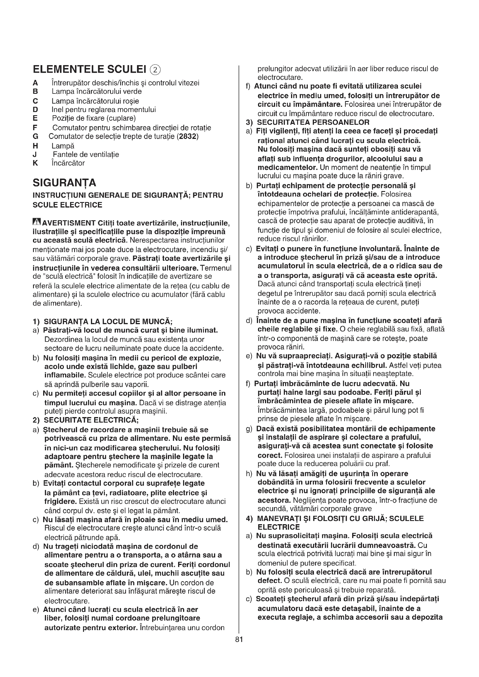 A Întrerupător deschis/închis şi controlul vitezei B Lampa încărcătorului verde C Lampa încărcătorului roşie D Inel pentru reglarea momentului E Poziţie de xare (cuplare) F Comutator pentru schimbarea direcţiei de rotaţie G Comutator de selecţie trepte de turaţie (2832) H Lampă J Fantele de ventilaţie K Încărcător SIGURANŢA