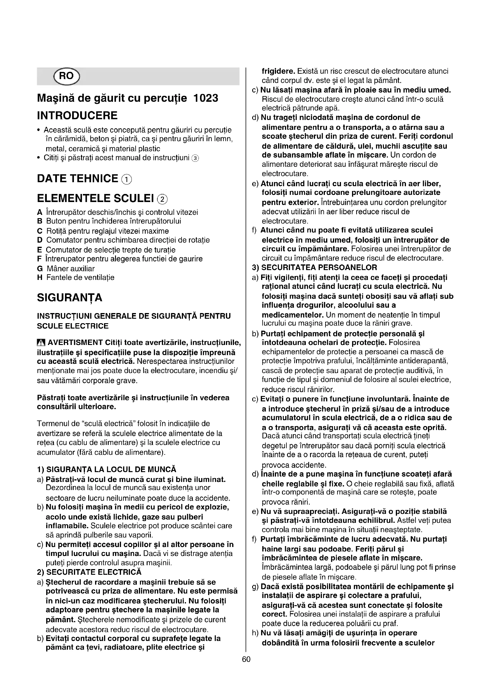 - Citiţi şi păstraţi acest manual de instrucţiuni 3 DATE TEHNICE 1 ELEMENTELE SCULEI 2 A Întrerupător deschis/închis şi controlul vitezei B Buton pentru închiderea întrerupătorului C Rotiţă pentru reglajul vitezei maxime D Comutator pentru schimbarea direcţiei de rotaţie E Comutator de selecţie trepte de turaţie F Întrerupator pentru alegerea functiei de gaurire G Mâner auxiliar H Fantele de ventilaţie SIGURANŢA