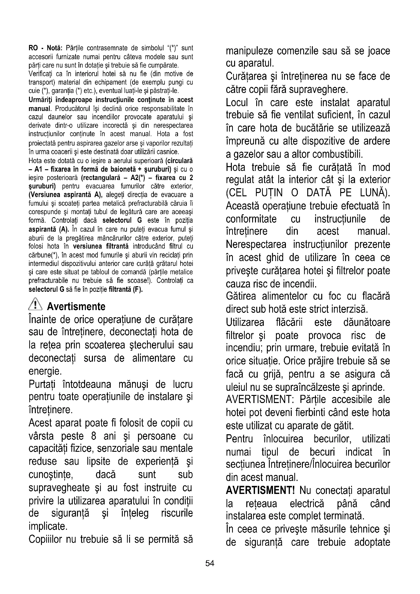съдомиялната машина, металният филтър да се обезцвети, но това по никакъв начин не влияе на неговата ефективност за задържане на мазнините. Подмяна на лампите (Внимание! Преди да се борави с лампите, уверете се, че те са студени): използвайте само лампи max 40W E14.54 RO - Notă: Părţile contrasemnate de simbolul “(*)” sunt accesorii furnizate numai pentru câteva modele sau sunt părţi care nu sunt în dotaţie şi trebuie să fie cumpărate. Verificaţi ca în interiorul hotei să nu fie (din motive de transport) material din echipament (de exemplu pungi cu cuie (*), garanţia (*) etc.), eventual luaţi-le şi păstraţi-le. Urmăriţi îndeaproape instrucţiunile conţinute în acest manual. Producătorul îşi declină orice responsabilitate în cazul daunelor sau incendiilor provocate aparatului şi derivate dintr-o utilizare incorectă şi din nerespectarea instrucţiunilor conţinute în acest manual. Hota a fost proiectată pentru aspirarea gazelor arse şi vaporilor rezultaţi în urma coacerii şi este destinată doar utilizării casnice. Hota este dotată cu o ieşire a aerului superioară (circulară – A1 – fixarea în formă de baionetă + şuruburi) şi cu o ieşire posterioară (rectangulară – A2(*) – fixarea cu 2 şuruburi) pentru evacuarea fumurilor către exterior, (Versiunea aspirantă A), alegeţi direcţia de evacuare a fumului şi scoateţi partea metalică prefracturabilă căruia îi corespunde şi montaţi tubul de legătură care are aceeaşi formă. Controlaţi dacă selectorul G este în poziţia aspirantă (A). În cazul în care nu puteţi evacua fumul şi aburii de la pregătirea mâncărurilor către exterior, puteţi folosi hota în versiunea filtrantă introducând filtrul cu cărbune(*), în acest mod fumurile şi aburii vin reciclaţi prin intermediul dispozitivului anterior care curăţă grătarul hotei şi care este situat pe tabloul de comandă (părţile metalice prefracturabile nu trebuie s ă fie scoase!). Controlaţi ca selectorul G să fie în poziţie filtrantă (F). Avertismente Înainte de orice operaţiune de curăţare sau de întreţinere, deconectaţi hota de la reţea prin scoaterea ştecherului sau deconectaţi sursa de alimentare cu energie. Purtaţi întotdeauna mănuşi de lucru pentru toate operaţiunile de instalare şi întreţinere. Acest aparat poate fi folosit de copii cu vârsta peste 8 ani şi persoane cu capacităţi fizice, senzoriale sau mentale reduse sau lipsite de experienţă şi cunoştinţe, dacă sunt sub supravegheate şi au fost instruite cu privire la utilizarea aparatului în condiţii de siguranţă şi înţeleg riscurile implicate. Copiiilor nu trebuie să li se permită să manipuleze comenzile sau să se joace cu aparatul. Curăţarea şi întreţinerea nu se face de către copii fără supraveghere. Locul în care este instalat aparatul trebuie să fie ventilat suficient, în cazul în care hota de bucătărie se utilizează împreună cu alte dispozitive de ardere a gazelor sau a altor combustibili. Hota trebuie să fie curăţată în mod regulat atât la interior cât şi la exterior (CEL PUŢIN O DATĂ PE LUNĂ). Această operaţiune trebuie efectuată în conformitate cu instrucţiunile de întreţinere din acest manual. Nerespectarea instrucţiunilor prezente în acest ghid de utilizare în ceea ce priveşte curăţarea hotei şi filtrelor poate cauza risc de incendii. Gătirea alimentelor cu foc cu flacără direct sub hotă este strict interzisă. Utilizarea flăcării este dăunătoare filtrelor şi poate provoca risc de incendiu; prin urmare, trebuie evitată în orice situaţie. Orice prăjire trebuie să se facă cu grijă, pentru a se asigura că uleiul nu se supraîncălzeste şi aprinde. AVERTISMENT: Părţile accesibile ale hotei pot deveni fierbinti când este hota este utilizat cu aparate de gătit. Pentru înlocuirea becurilor, utilizati numai tipul de becuri indicat în secţiunea Întreţinere/Înlocuirea becurilor din acest manual. AVERTISMENT! Nu conectaţi aparatul la reţeaua electrică până când instalarea este complet terminată. În ceea ce priveşte măsurile tehnice şi de siguranţă care trebuie adoptate55 pentru evacuarea fumului, este important să se urmărească îndeaproape normele locale. Sistemul de evacuare a fumului pentru acest aparat nu trebuie să fie conectat la nici sistem de ventilaţie existent care este folosit în alte scopuri, cum ar fi evacuarea gazelor de ardere rezultate de la aparatele consumatoare de gaz sau alţi combustibili. Nu folosiţi şi nu lăsaţi hota fără bec montat corect din cauza riscului de electrocutare. Nu folosiţi niciodată hota fără ca aceasta să aibă grilele montate în mod eficient. Hota nu trebuie utilizată NICIODATĂ ca suprafaţă de sprijin dacă acest lucru nu este precizat in mod expres. Folosiţi numai şuruburile de fixare furnizate împreună cu produsul pentru instalare sau, în cazul în care nu sunt incluse, achiziţionaţi tipul corespunzător de şuruburi. Use the correct length for the screws which are identified in the Installation Guide. În caz de incertitudine, consultaţi un centru de asistenţă service autorizat sau o persoană cu calificare corespunzătoare. AVERTISMENT! Neinstalarea şuruburilor sau a dispozitivul de fixare în conformitate cu aceste instrucţiuni poate duce la pericolelor de natură electrică. Ne declinăm orice responsabilitate pentru orice defecte, daune sau incendii cauzate aparatului ca urmare a nerespectării instrucţiunilor prezente în acest manual. Acest aparat este marcat în conformitate cu Directiva Europeană 2012/19/EC referitoare la Deşeurile de Echipament Electric şi Electronic (WEEE). Asigurându-vă că acest produs este eliminat în mod 
