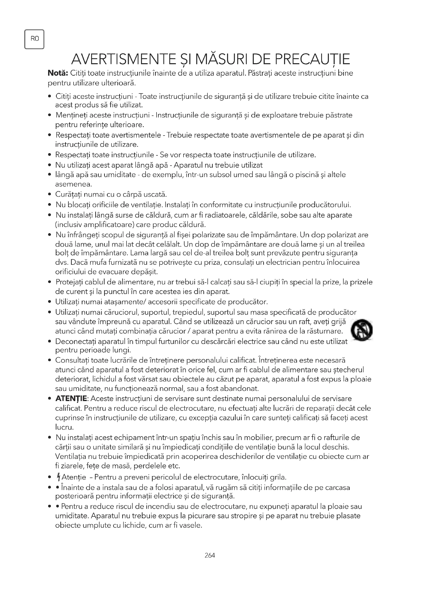 AVERTISMENTE ȘI MĂSURI DE PRECAUȚIE Notă: Citiți toate instrucțiunile înainte de a utiliza aparatul. Păstrați aceste instrucțiuni bine pentru utilizare ulterioară.