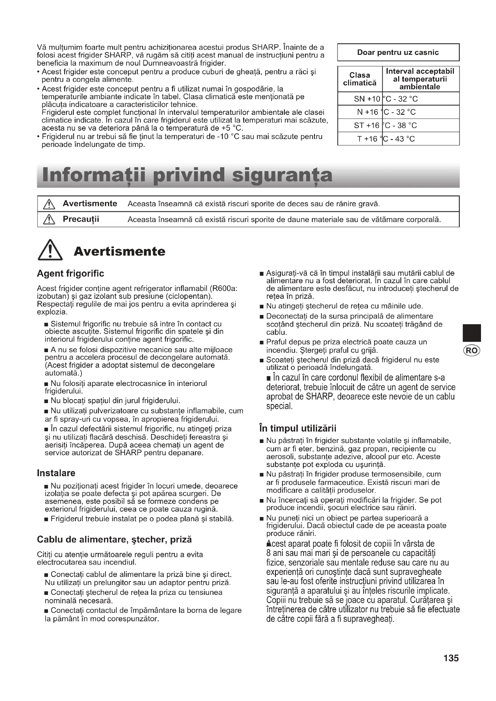 - Frigiderul nu ar trebui să e ţinut la temperaturi de -10 °C sau mai scăzute pentru perioade îndelungate de timp. Agent frigoric Acest frigider conţine agent refrigerator inamabil (R600a: izobutan) şi gaz izolant sub presiune (ciclopentan). Respectaţi regulile de mai jos pentru a evita aprinderea şi explozia. ■ Sistemul frigoric nu trebuie să intre în contact cu obiecte ascuţite. Sistemul frigoric din spatele şi din interiorul frigiderului conţine agent frigoric. ■ A nu se folosi dispozitive mecanice sau alte mijloace pentru a accelera procesul de decongelare automată. (Acest frigider a adoptat sistemul de decongelare automată.) ■ Nu folosiţi aparate electrocasnice în interiorul frigiderului. ■ Nu blocaţi spaţiul din jurul frigiderului. ■ Nu utilizaţi pulverizatoare cu substanţe inamabile, cum ar spray-uri cu vopsea, în apropierea frigiderului. ■ În cazul defectării sistemul frigoric, nu atingeţi priza şi nu utilizaţi acără deschisă. Deschideţi fereastra şi aerisiţi încăperea. După aceea chemaţi un agent de service autorizat de SHARP pentru depanare. Instalare ■ Nu poziţionaţi acest frigider în locuri umede, deoarece izolaţia se poate defecta şi pot apărea scurgeri. De asemenea, este posibil să se formeze condens pe exteriorul frigiderului, ceea ce poate cauza rugină. ■ Frigiderul trebuie instalat pe o podea plană şi stabilă. Cablu de alimentare, ştecher, priză Citiţi cu atenţie următoarele reguli pentru a evita electrocutarea sau incendiul. ■ Conectaţi cablul de alimentare la priză bine şi direct. Nu utilizaţi un prelungitor sau un adaptor pentru priză. ■ Conectaţi ştecherul de reţea la priza cu tensiunea nominală necesară. ■ Conectaţi contactul de împământare la borna de legare la pământ în mod corespunzător. ■ Asiguraţi-vă că în timpul instalării sau mutării cablul de alimentare nu a fost deteriorat. În cazul în care cablul de alimentare este desfăcut, nu introduceţi ştecherul de reţea în priză. ■ Nu atingeţi ştecherul de reţea cu mâinile ude. ■ Deconectaţi de la sursa principală de alimentare scoţând ştecherul din priză. Nu scoateţi trăgând de cablu. ■ Praful depus pe priza electrică poate cauza un incendiu. Ştergeţi praful cu grijă. ■ Scoateţi ştecherul din priză dacă frigiderul nu este utilizat o perioadă îndelungată. ■ În cazul în care cordonul exibil de alimentare s-a deteriorat, trebuie înlocuit de către un agent de service aprobat de SHARP, deoarece este nevoie de un cablu special. În timpul utilizării ■ Nu păstraţi în frigider substanţe volatile şi inamabile, cum ar eter, benzină, gaz propan, recipiente cu aerosoli, substanţe adezive, alcool pur etc. Aceste substanţe pot exploda cu uşurinţă. ■ Nu păstraţi în frigider produse termosensibile, cum ar produsele farmaceutice. Există riscuri mari de modicare a calităţii produselor. ■ Nu încercaţi să operaţi modicări la frigider. Se pot produce incendii, şocuri electrice sau răniri. ■ Nu puneţi nici un obiect pe partea superioară a frigiderului. Dacă obiectul cade de pe aceasta poate produce răniri.