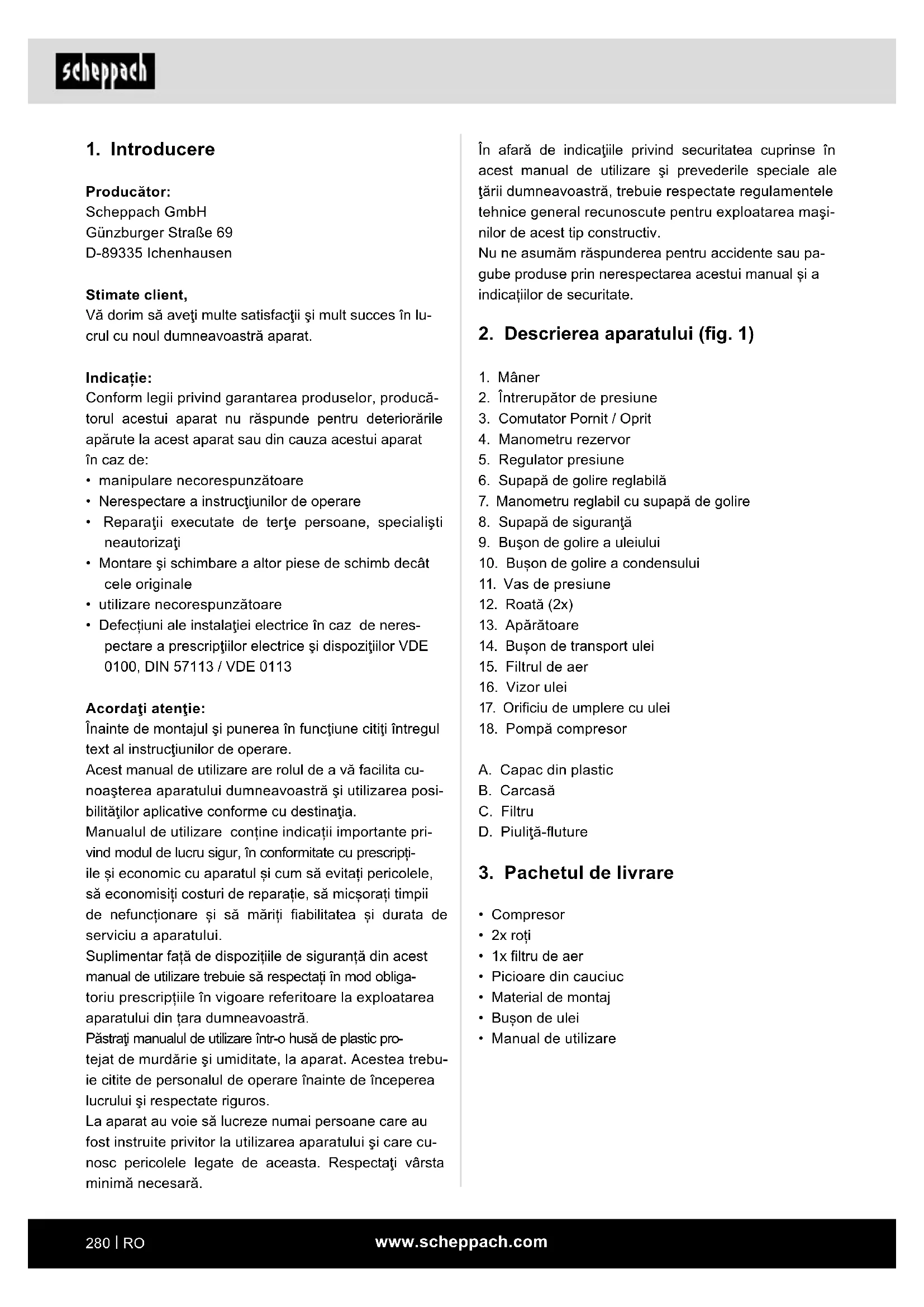 Producător: Scheppach GmbH Günzburger Straße 69 D-89335 Ichenhausen Stimate client, Vă dorim să aveţi multe satisfacţii şi mult succes în lu- crul cu noul dumneavoastră aparat. Indicație: Conform legii privind garantarea produselor, producă- torul acestui aparat nu răspunde pentru deteriorările apărute la acest aparat sau din cauza acestui aparat în caz de: