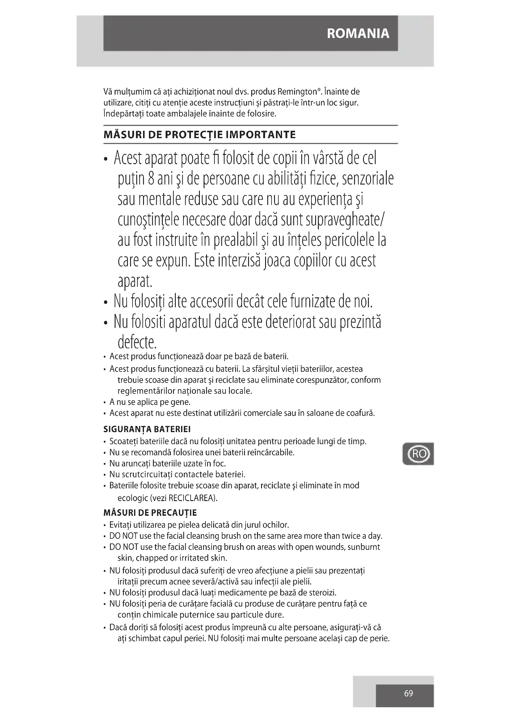 ROMANIA Vă mulţumim că aţi achiziţionat noul dvs. produs Remington®. Înainte de utilizare, citiţi cu atenţie aceste instrucţiuni şi păstraţi-le într-un loc sigur. Îndepărtaţi toate ambalajele înainte de folosire.