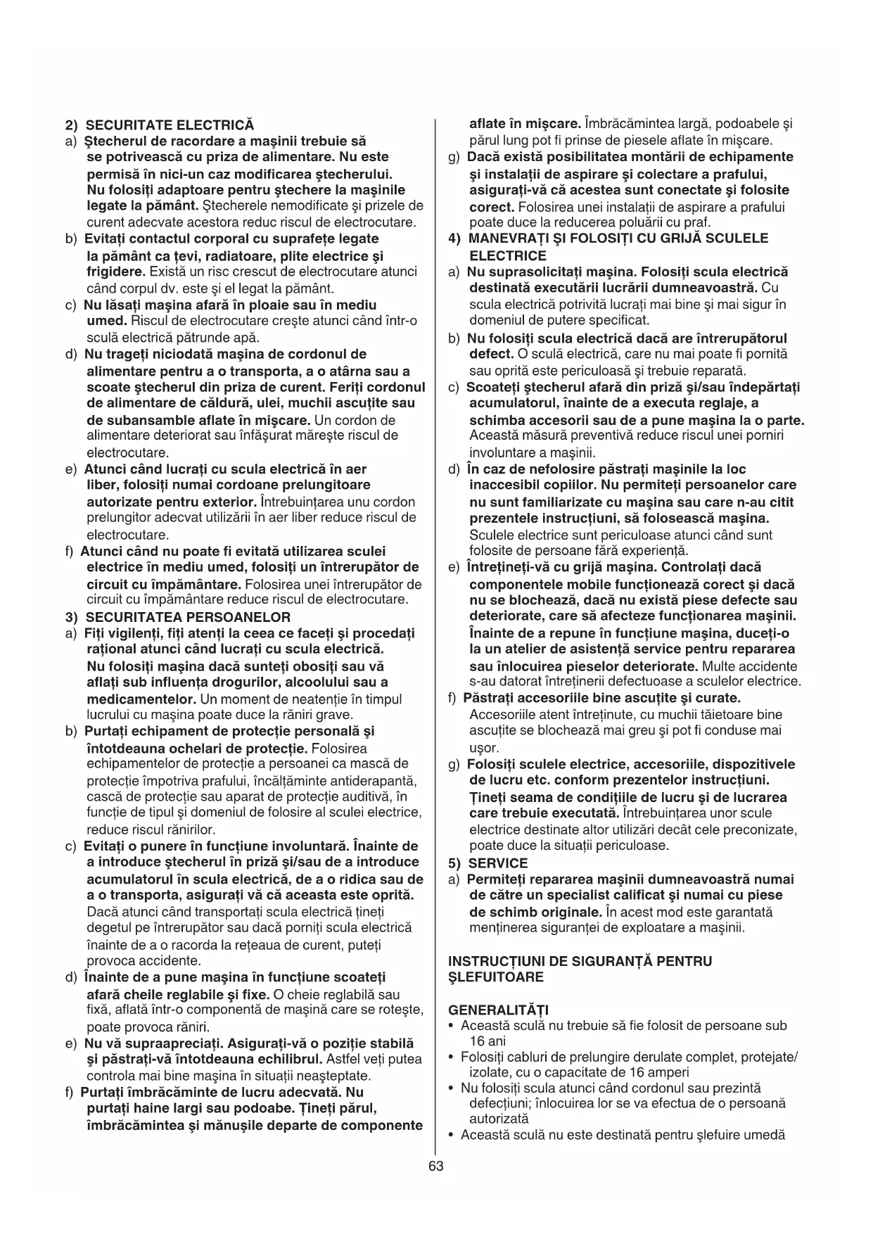 a) Păstraţi-vă locul de muncă curat şi bine iluminat. Dezordinea la locul de muncă sau existenţa unor sectoare de lucru neiluminate poate duce la accidente. b) Nu folosiţi maşina în medii cu pericol de explozie, acolo unde există lichide, gaze sau pulberi inamabile. Sculele electrice pot produce scântei care să aprindă pulberile sau vaporii. c) Nu permiteţi accesul copiilor şi al altor persoane în timpul lucrului cu maşina. Dacă vi se distrage atenţia puteţi pierde controlul asupra maşinii.63