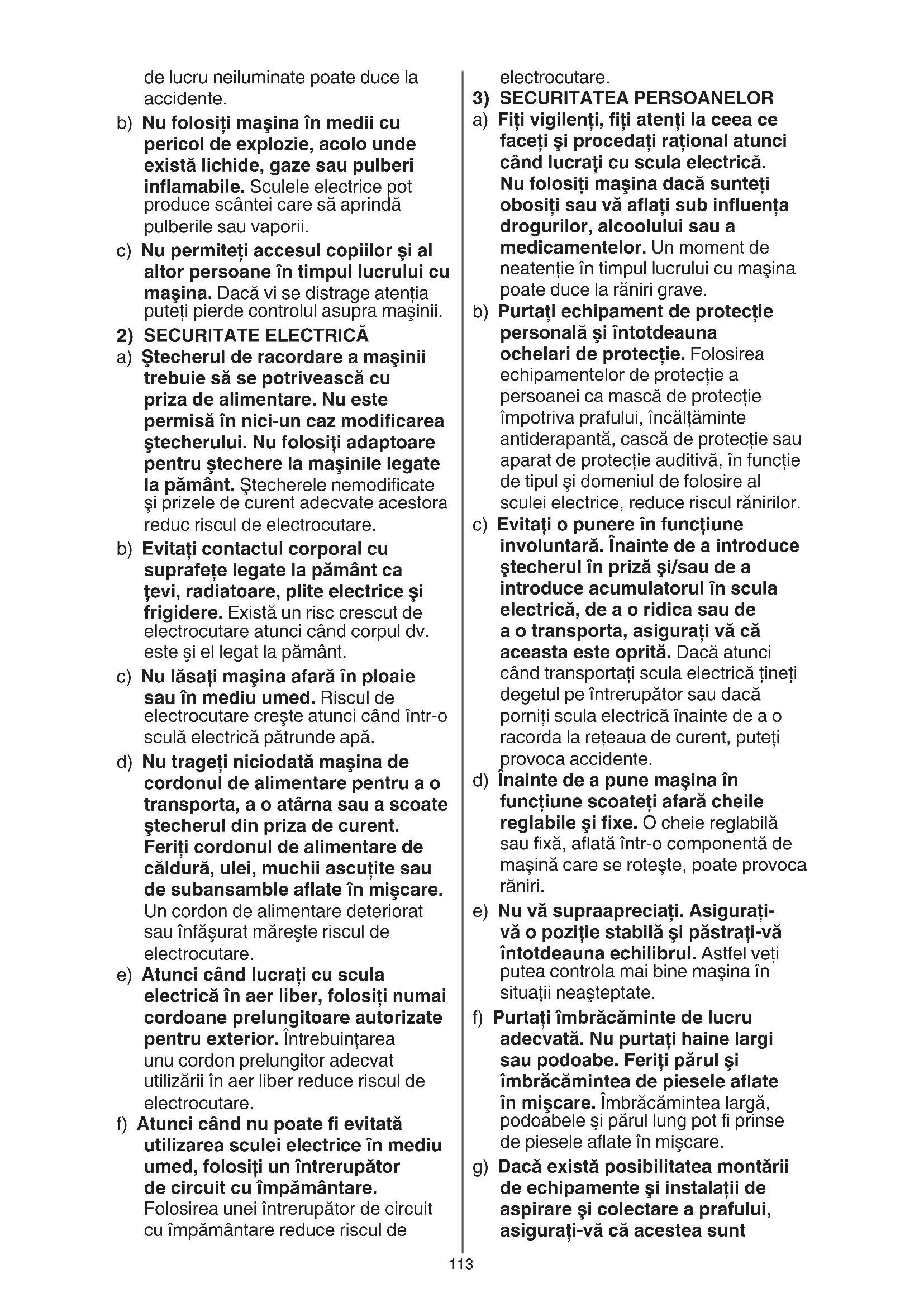 a) Ştecherul de racordare a maşinii trebuie să se potrivească cu priza de alimentare. Nu este permisă în nici-un caz modicarea ştecherului. Nu folosiţi adaptoare pentru ştechere la maşinile legate la pământ. Ştecherele nemodicate şi prizele de curent adecvate acestora reduc riscul de electrocutare. b) Evitaţi contactul corporal cu suprafeţe legate la pământ ca ţevi, radiatoare, plite electrice şi frigidere. Există un risc crescut de electrocutare atunci când corpul dv. este şi el legat la pământ. c) Nu lăsaţi maşina afară în ploaie sau în mediu umed. Riscul de electrocutare creşte atunci când într-o sculă electrică pătrunde apă. d) Nu trageţi niciodată maşina de cordonul de alimentare pentru a o transporta, a o atârna sau a scoate ştecherul din priza de curent. Feriţi cordonul de alimentare de căldură, ulei, muchii ascuţite sau de subansamble aate în mişcare. Un cordon de alimentare deteriorat sau înfăşurat măreşte riscul de electrocutare. e) Atunci când lucraţi cu scula electrică în aer liber, folosiţi numai cordoane prelungitoare autorizate pentru exterior. Întrebuinţarea unu cordon prelungitor adecvat utilizării în aer liber reduce riscul de electrocutare. f) Atunci când nu poate evitată utilizarea sculei electrice în mediu umed, folosiţi un întrerupător de circuit cu împământare. Folosirea unei întrerupător de circuit cu împământare reduce riscul de114 f) Păstraţi accesoriile bine ascuţite şi curate. Accesoriile atent întreţinute, cu muchii tăietoare bine ascuţite se blochează mai greu şi pot conduse mai uşor. g) Folosiţi sculele electrice, accesoriile, dispozitivele de lucru etc. conform prezentelor instrucţiuni. Ţineţi seama de condiţiile de lucru şi de lucrarea care trebuie executată. Întrebuinţarea unor scule electrice destinate altor utilizări decât cele preconizate, poate duce la situaţii periculoase. h) Menţineţi mânerele şi zonele de prindere uscate, curate şi feriţi-le de ulei şi unsoare. Mânerele şi zonele de prindere alunecoase nu permit manevrarea şi controlul sigur al sculei electrice în situaţii neaşteptate.