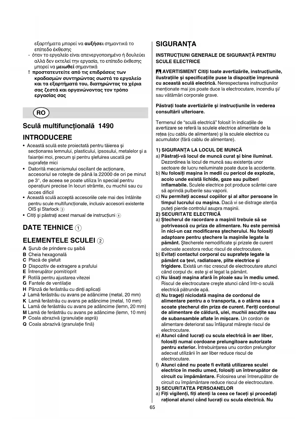 - Citiţi şi păstraţi acest manual de instrucţiuni 4 DATE TEHNICE 1 ELEMENTELE SCULEI 2 A Şurub de prindere cu şaibă B Cheia hexagonală C Placă de şlefuit D Dispozitiv de extragere a prafului E Întrerupător pornit/oprit F Rotilă pentru ajustarea vitezei G Fantele de ventilaţie H Pânză de ferăstrău cu dinţi aplicaţi J Lamă ferăstrău cu avans pe adâncime (metal, 20 mm) K Lamă ferăstrău cu avans pe adâncime (metal, 10 mm) L Lamă de ferăstrău cu avans pe adâncime (lemn, 20 mm) M Lamă de ferăstrău cu avans pe adâncime (lemn, 10 mm) P Coala abrazivă (granulaţie aspră) Q Coala abrazivă (granulaţie fină) SIGURANŢA
