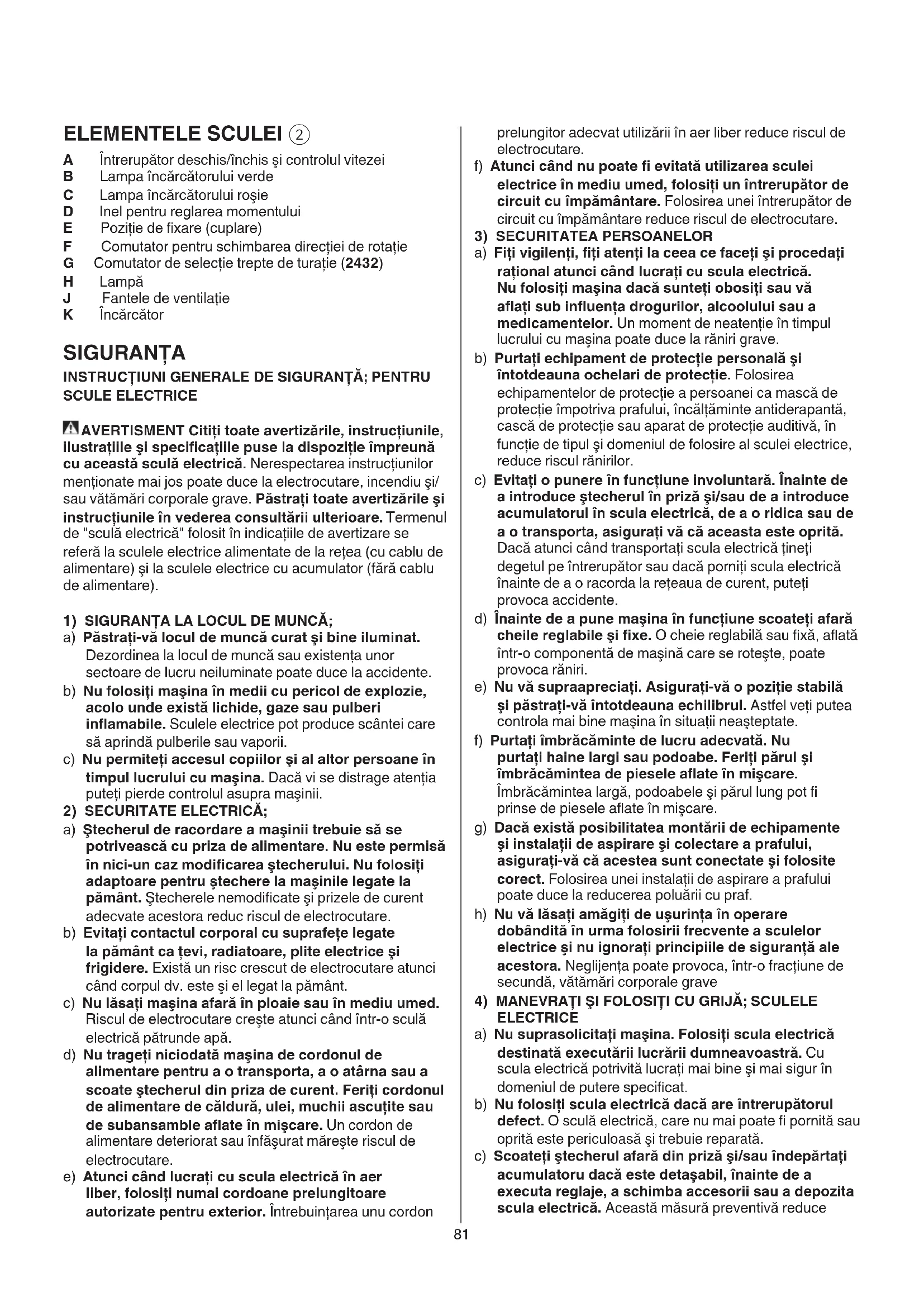 A Întrerupător deschis/închis şi controlul vitezei B Lampa încărcătorului verde C Lampa încărcătorului roşie D Inel pentru reglarea momentului E Poziţie de xare (cuplare) F Comutator pentru schimbarea direcţiei de rotaţie G Comutator de selecţie trepte de turaţie (2432) H Lampă J Fantele de ventilaţie K Încărcător SIGURANŢA