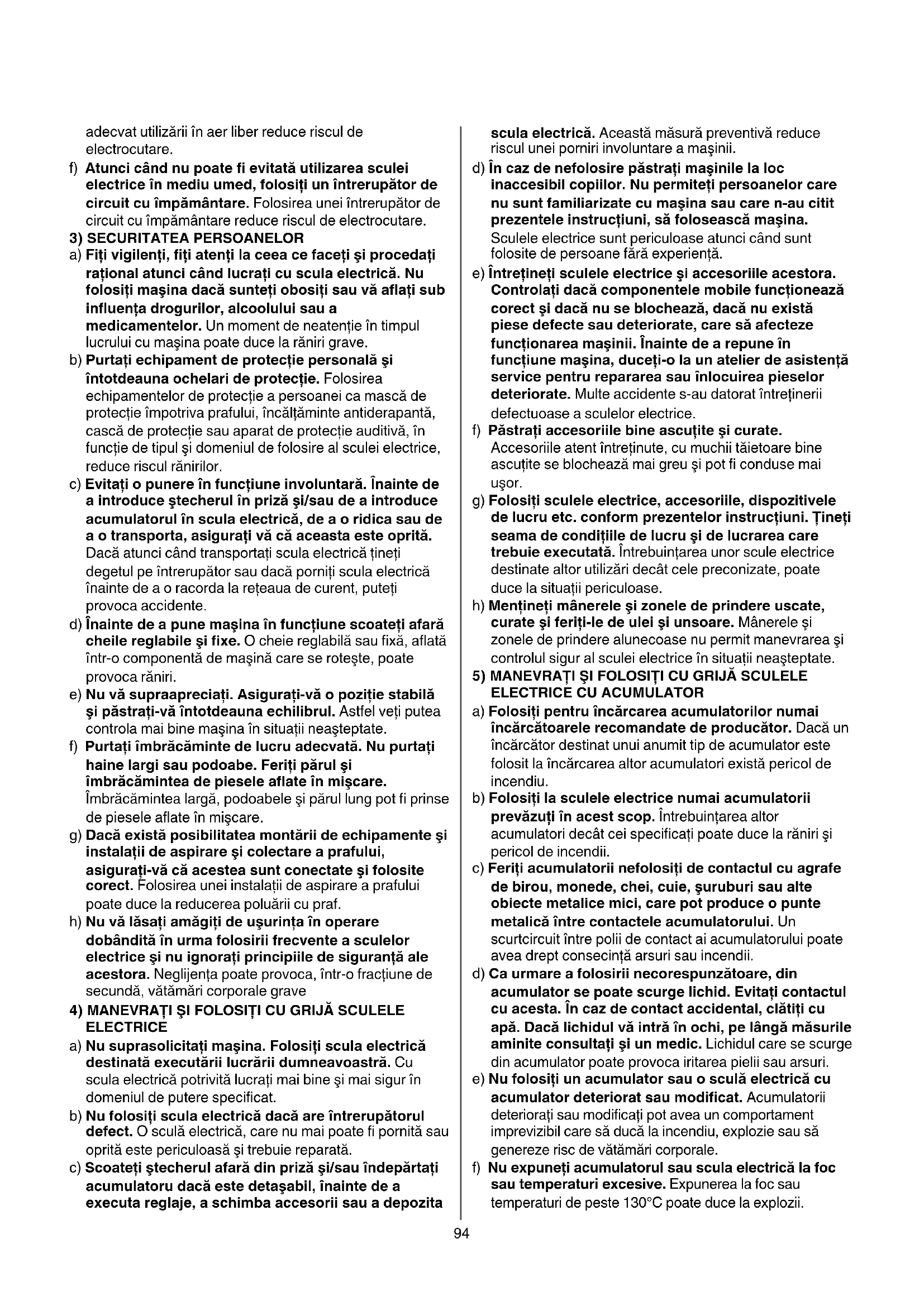 ELECTRICE a) Nu suprasolicitaţi maşina. Folosiţi scula electrică destinată executării lucrării dumneavoastră. Cu scula electrică potrivită lucraţi mai bine şi mai sigur în domeniul de putere specificat. b) Nu folosiţi scula electrică dacă are întrerupătorul defect. O sculă electrică, care nu mai poate fi pornită sau oprită este periculoasă şi trebuie reparată. c) Scoateţi ştecherul afară din priză şi/sau îndepărtaţi acumulatoru dacă este detaşabil, înainte de a executa reglaje, a schimba accesorii sau a depozita scula electrică. Această măsură preventivă reduce riscul unei porniri involuntare a maşinii. d) În caz de nefolosire păstraţi maşinile la loc inaccesibil copiilor. Nu permiteţi persoanelor care nu sunt familiarizate cu maşina sau care n-au citit prezentele instrucţiuni, să folosească maşina. Sculele electrice sunt periculoase atunci când sunt folosite de persoane fără experienţă. e) Întreţineţi sculele electrice şi accesoriile acestora. Controlaţi dacă componentele mobile funcţionează corect şi dacă nu se blochează, dacă nu există piese defecte sau deteriorate, care să afecteze funcţionarea maşinii. Înainte de a repune în funcţiune maşina, duceţi-o la un atelier de asistenţă service pentru repararea sau înlocuirea pieselor deteriorate. Multe accidente s-au datorat întreţinerii defectuoase a sculelor electrice. f) Păstraţi accesoriile bine ascuţite şi curate. Accesoriile atent întreţinute, cu muchii tăietoare bine ascuţite se blochează mai greu şi pot fi conduse mai uşor. g) Folosiţi sculele electrice, accesoriile, dispozitivele de lucru etc. conform prezentelor instrucţiuni. Ţineţi seama de condiţiile de lucru şi de lucrarea care trebuie executată. Întrebuinţarea unor scule electrice destinate altor utilizări decât cele preconizate, poate duce la situaţii periculoase. h) Menţineţi mânerele şi zonele de prindere uscate, curate şi feriţi-le de ulei şi unsoare. Mânerele şi zonele de prindere alunecoase nu permit manevrarea şi controlul sigur al sculei electrice în situaţii neaşteptate.