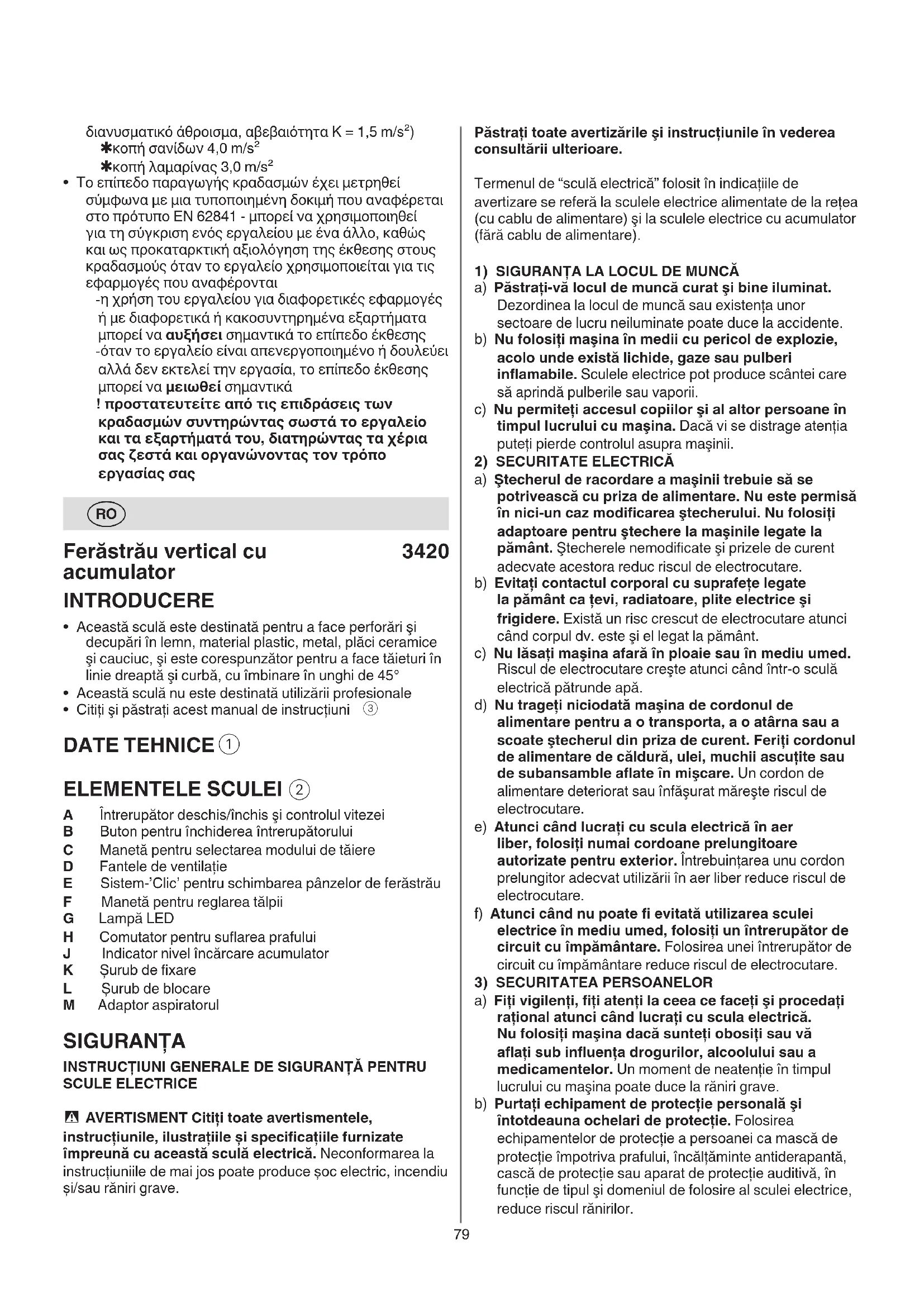 a) Fiţi vigilenţi, ţi atenţi la ceea ce faceţi şi procedaţi raţional atunci când lucraţi cu scula electrică. Nu folosiţi maşina dacă sunteţi obosiţi sau vă aaţi sub inuenţa drogurilor, alcoolului sau a medicamentelor. Un moment de neatenţie în timpul lucrului cu maşina poate duce la răniri grave. b) Purtaţi echipament de protecţie personală şi întotdeauna ochelari de protecţie. Folosirea echipamentelor de protecţie a persoanei ca mască de protecţie împotriva prafului, încălţăminte antiderapantă, cască de protecţie sau aparat de protecţie auditivă, în funcţie de tipul şi domeniul de folosire al sculei electrice, reduce riscul rănirilor. διανυσματικό άθροισμα, αβεβαιότητα K = 1,5 m/s²) ✱ κοπή σανίδων 4,0 m/s² ✱ κοπή λαμαρίνας 3,0 m/s²