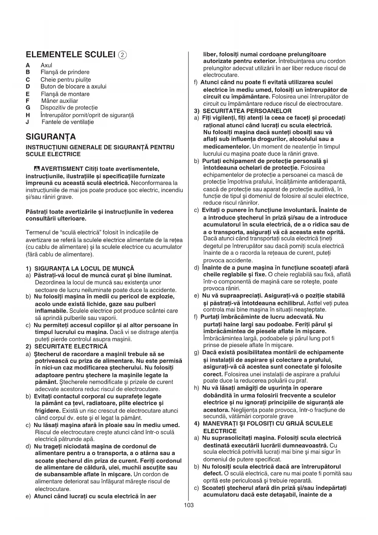 A Axul B Flanşă de prindere C Cheie pentru piuliţe D Buton de blocare a axului E Flanşă de montare F Mâner auxiliar G Dispozitiv de protecţie H Întrerupător pornit/oprit de siguranţă J Fantele de ventilaţie SIGURANŢA
