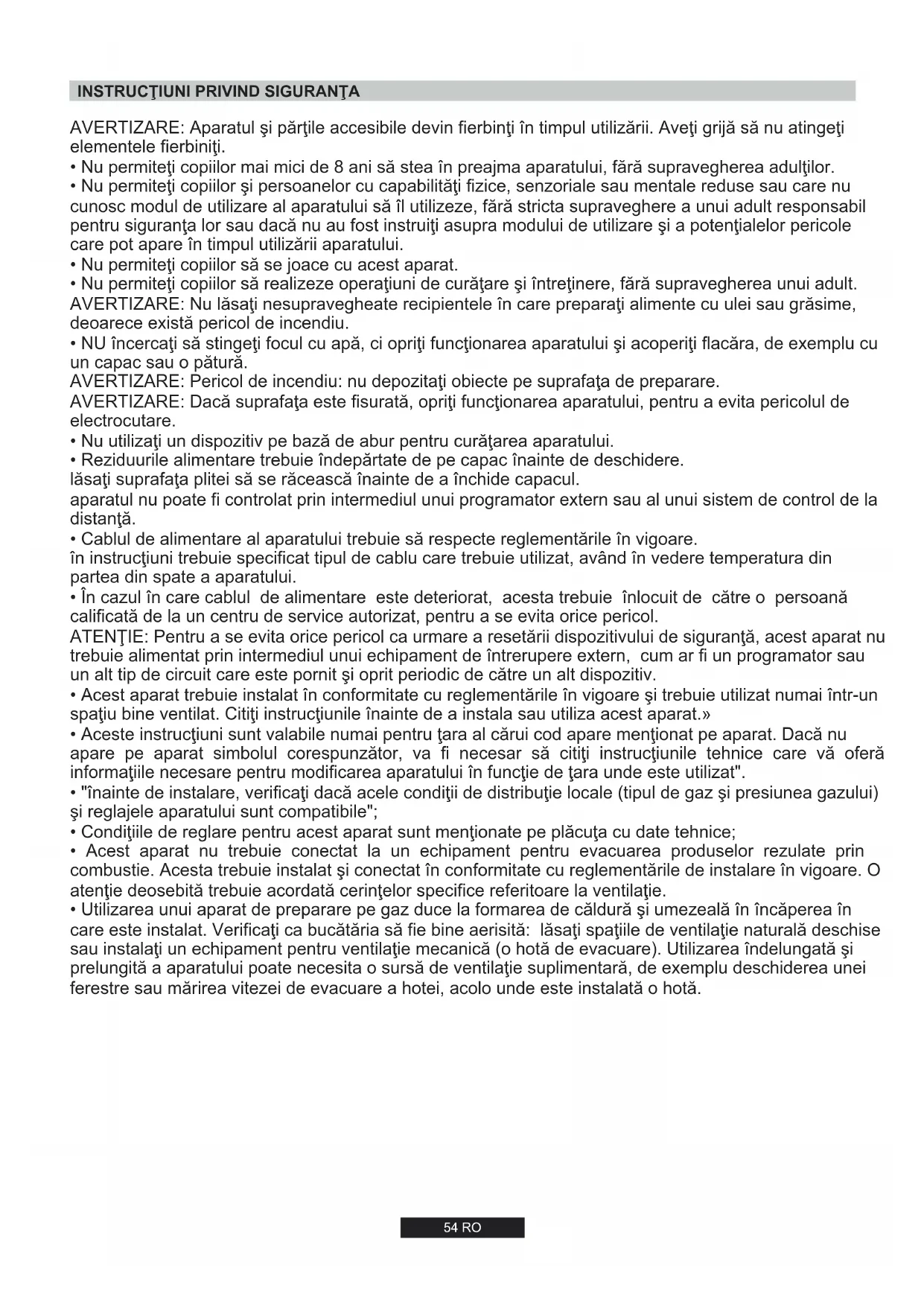 - Utilizarea unui aparat de preparare pe gaz duce la formarea de căldură şi umezeală în încăperea în care este instalat. Verificaţi ca bucătăria să fie bine aerisită: lăsaţi spaţiile de ventilaţie naturală deschise sau instalaţi un echipament pentru ventilaţie mecanică (o hotă de evacuare). Utilizarea îndelungată şi prelungită a aparatului poate necesita o sursă de ventilaţie suplimentară, de exemplu deschiderea unei ferestre sau mărirea vitezei de evacuare a hotei, acolo unde este instalată o hotă.55 RO